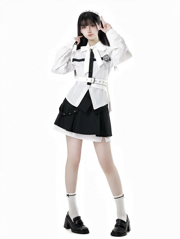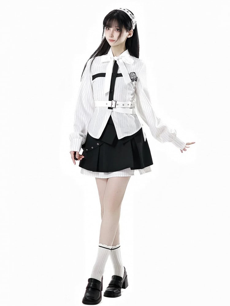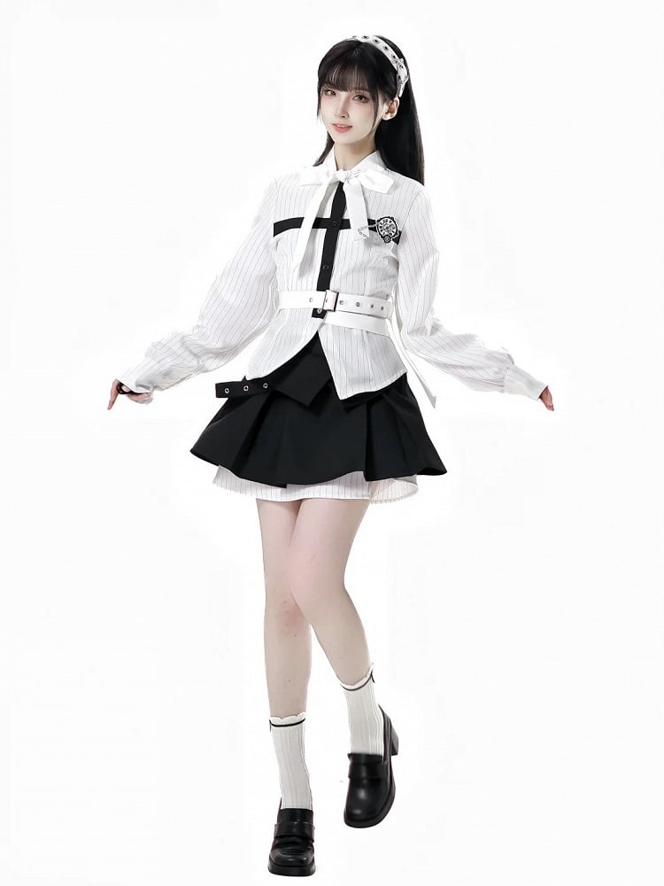 ブラッククロスデザインのホワイトストライプ、セルフタイボウシャツ、取り外し可能なバタフライクロックブローチ付き