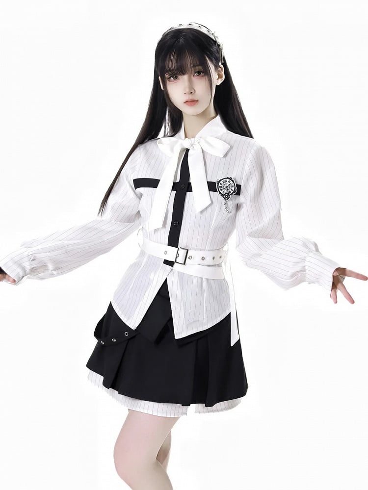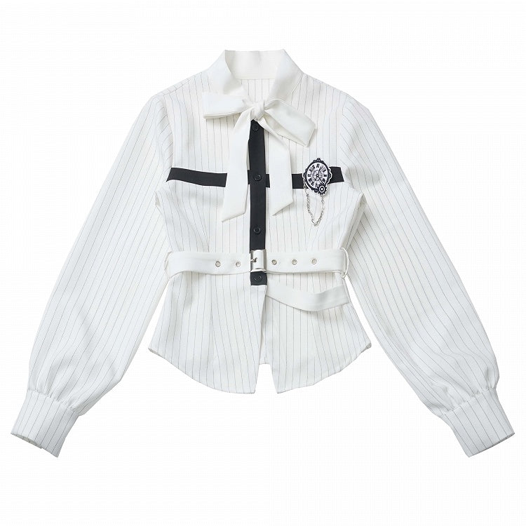 取り外し可能な蝶の時計ブローチ付きシャツ、リボン、黒のセルフタイ、白のストライプ、クロスデザイン
