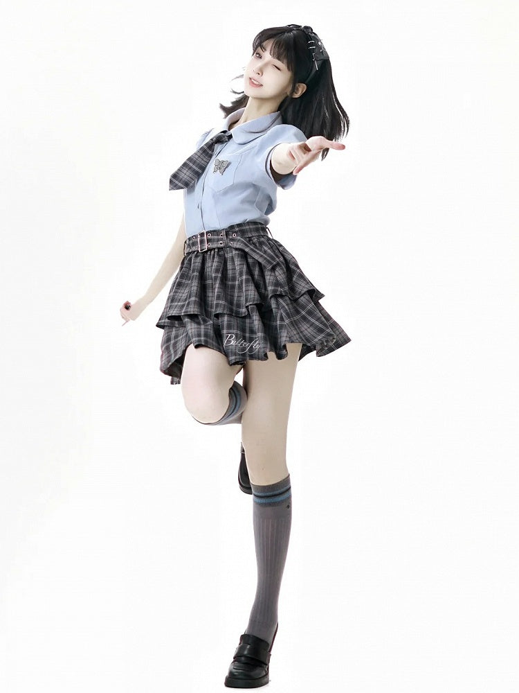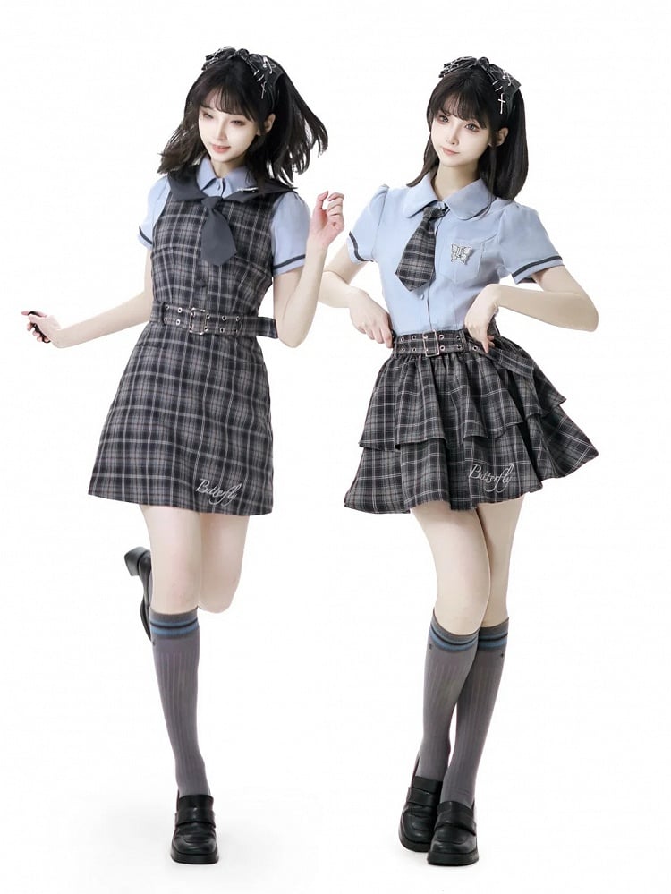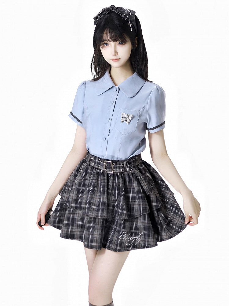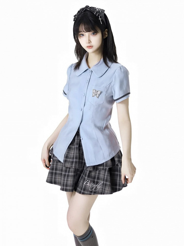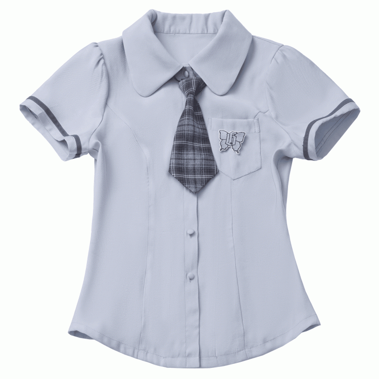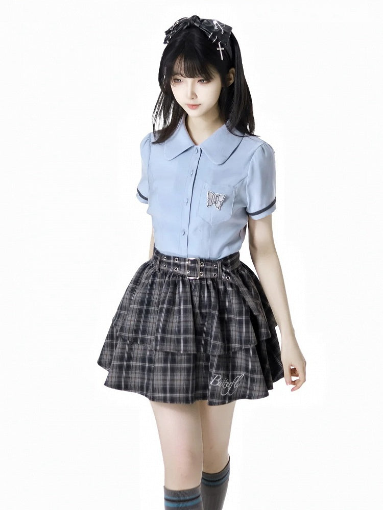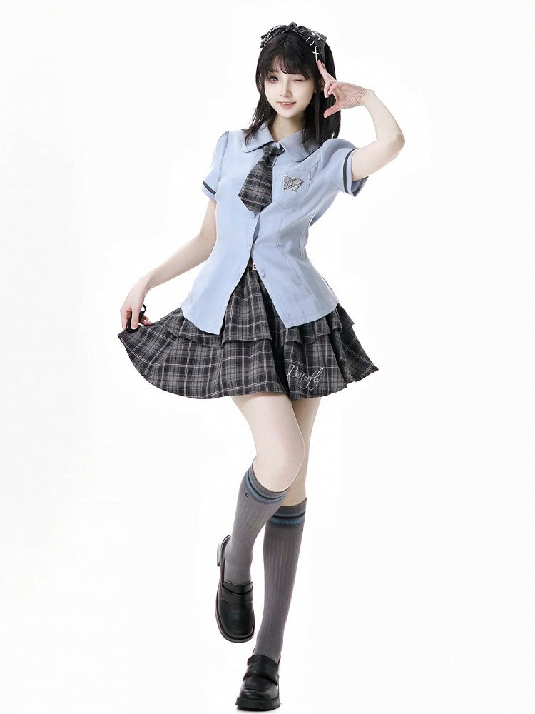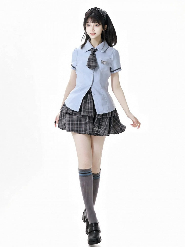 グレーブルーのプレッピースタイルの半袖チェック柄ネクタイ付きシャツ