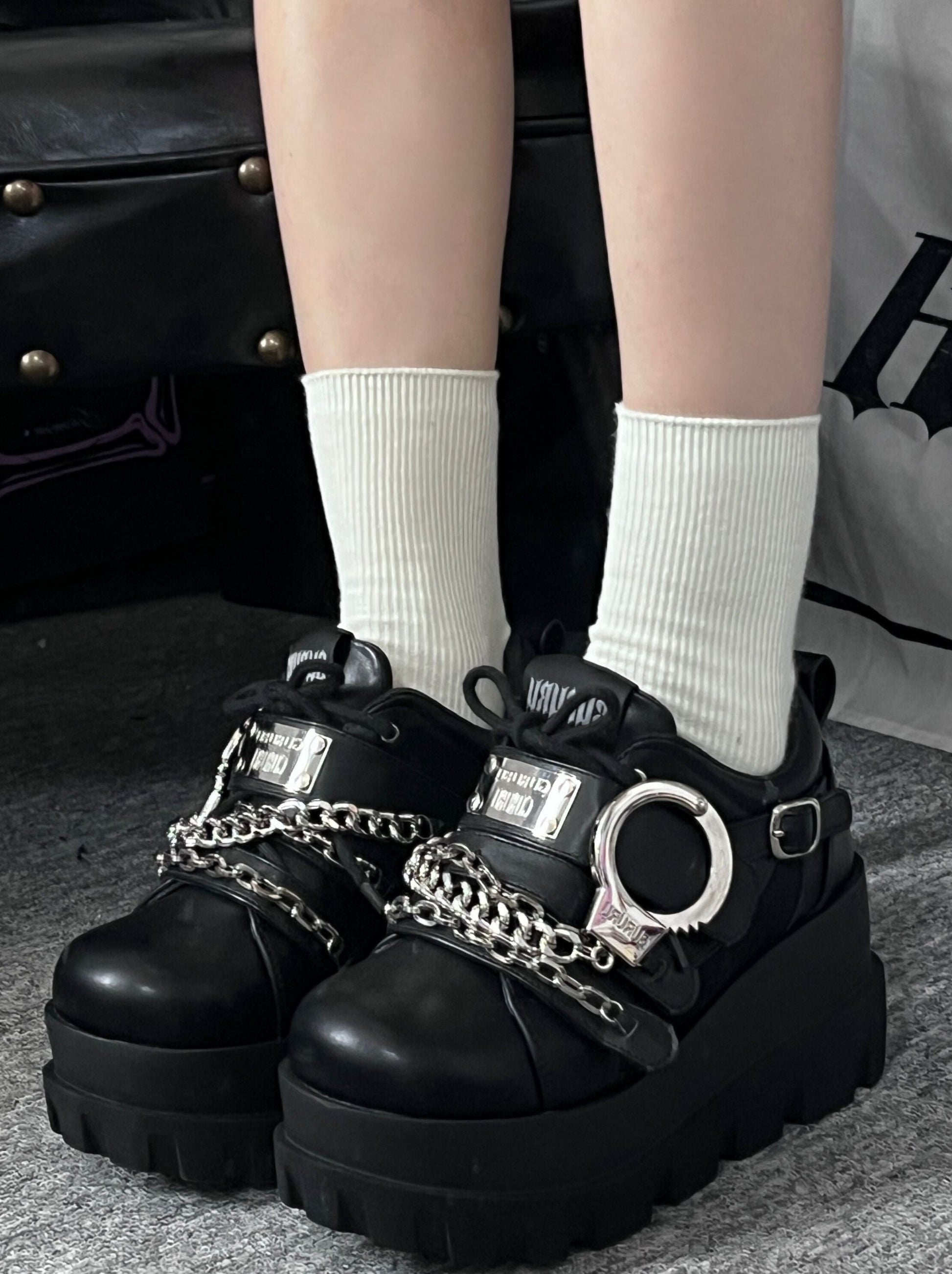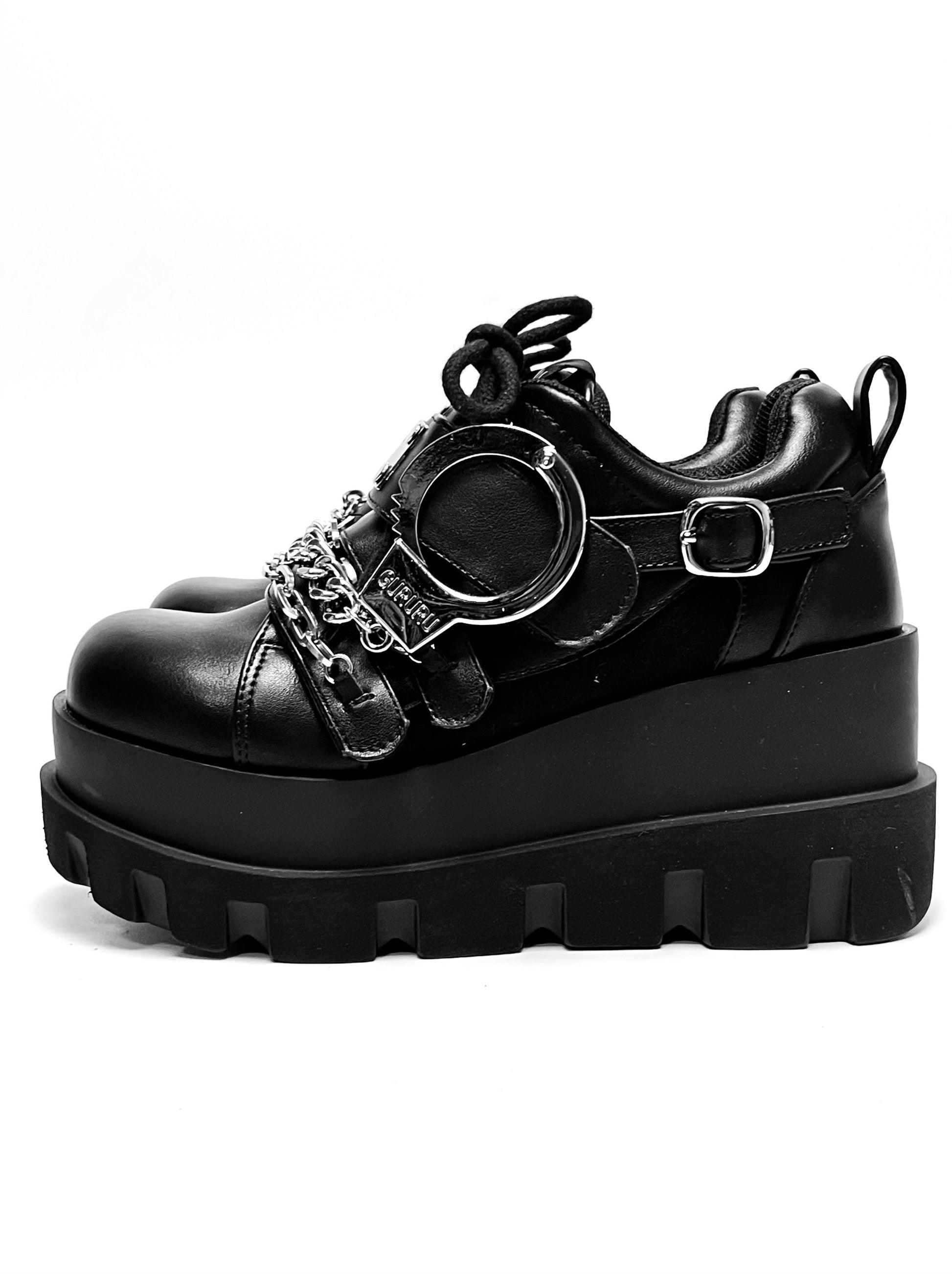 このキュートなプラットフォームシューズで、個性的なスタイルを演出しましょう。ハンドカフとダークメタルのディテールが、遊び心とエッジの効いた雰囲気を演出します。高さのある履き心地と快適な履き心地をお楽しみください。