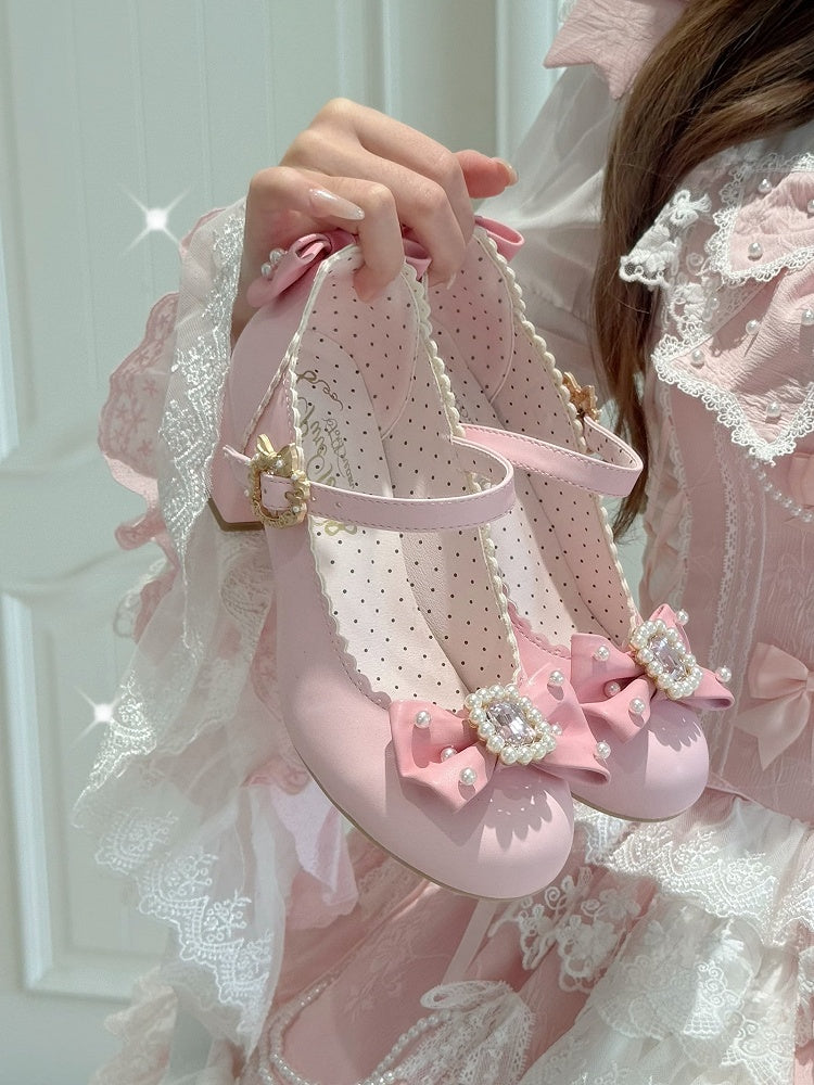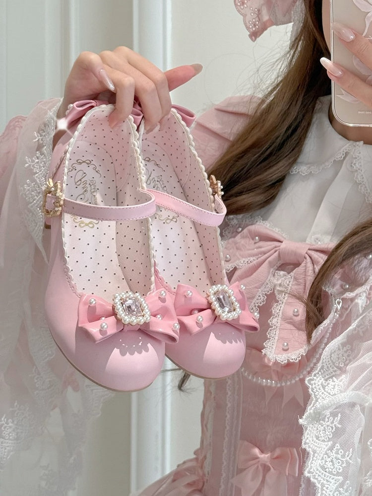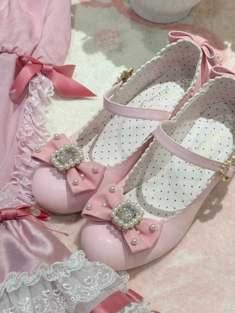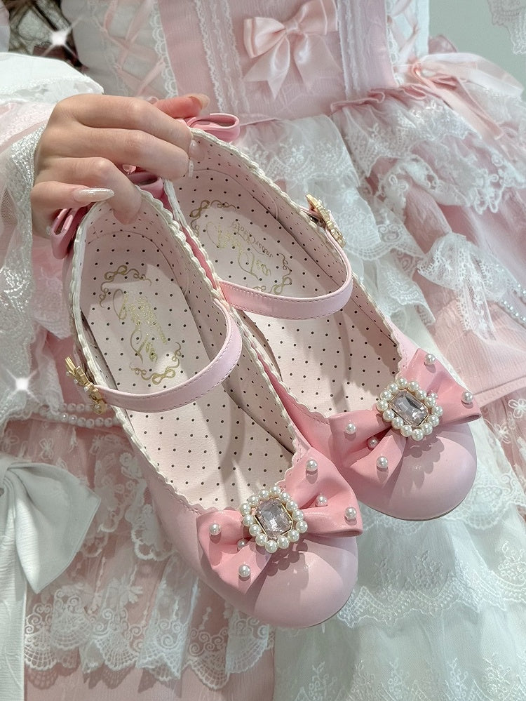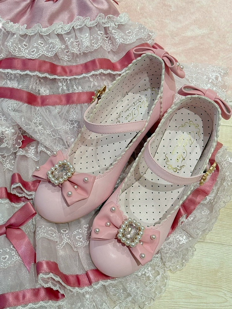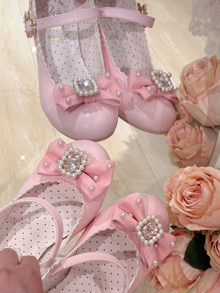 ジェーンズ ボウノット ラインストーン装飾 ラウンド メアリー ロリータ ディテール ビーズトゥ ピンク