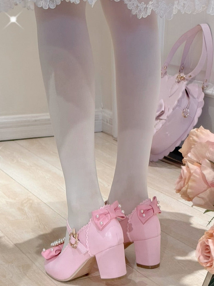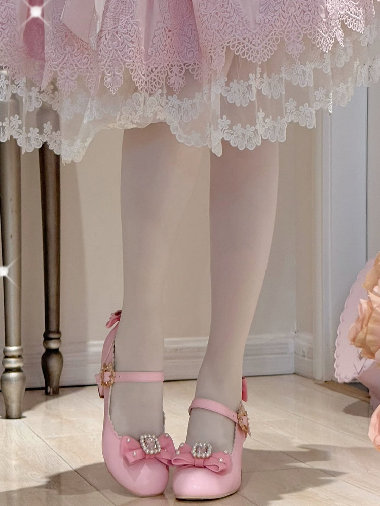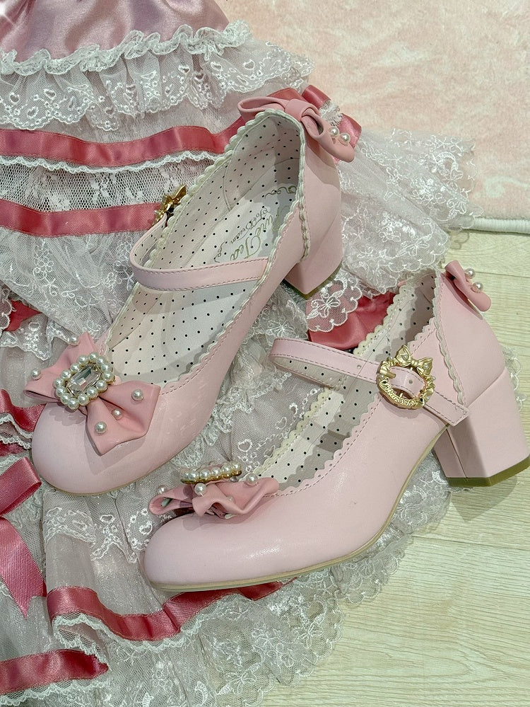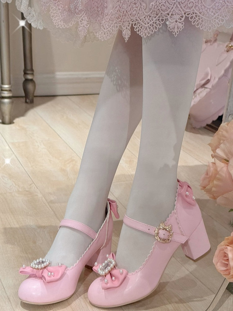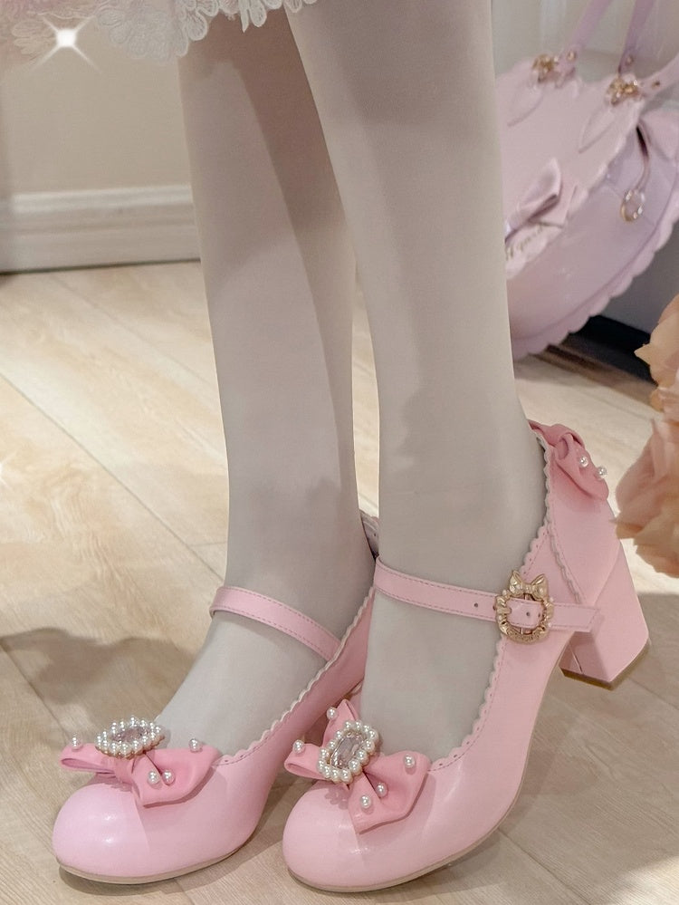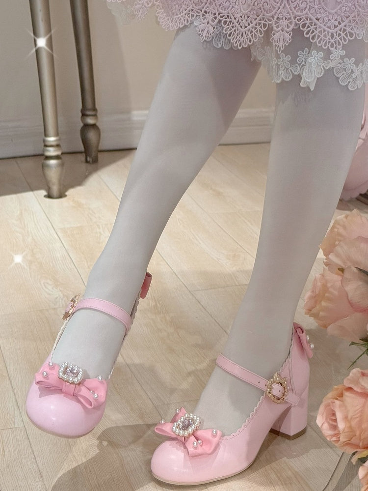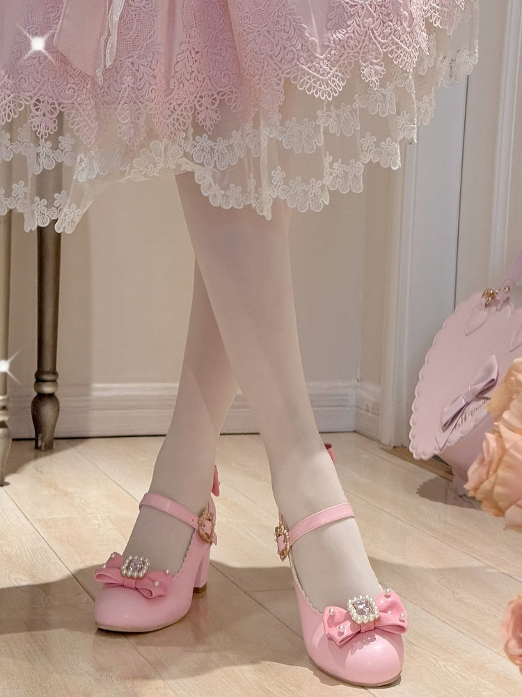 ジェーンズ ボウノット ラインストーン装飾 ラウンド メアリー ロリータ ディテール ビーズトゥ ピンク