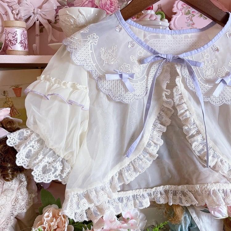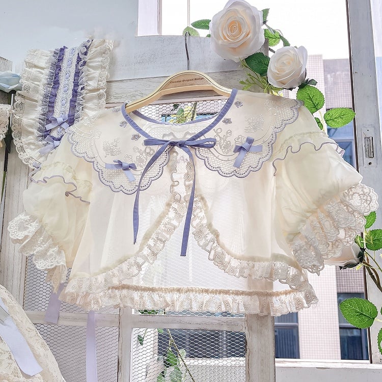 ショート丈クロップド丈刺繍トップス、スカラップカラー、パープルスリーブトリム