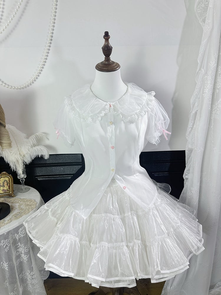 ショート丈フラットカラースリーブラウンドブラウスホワイトパフ