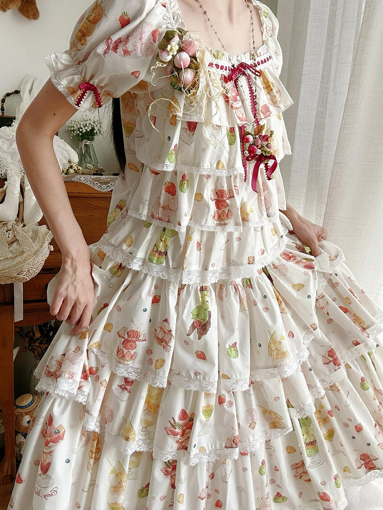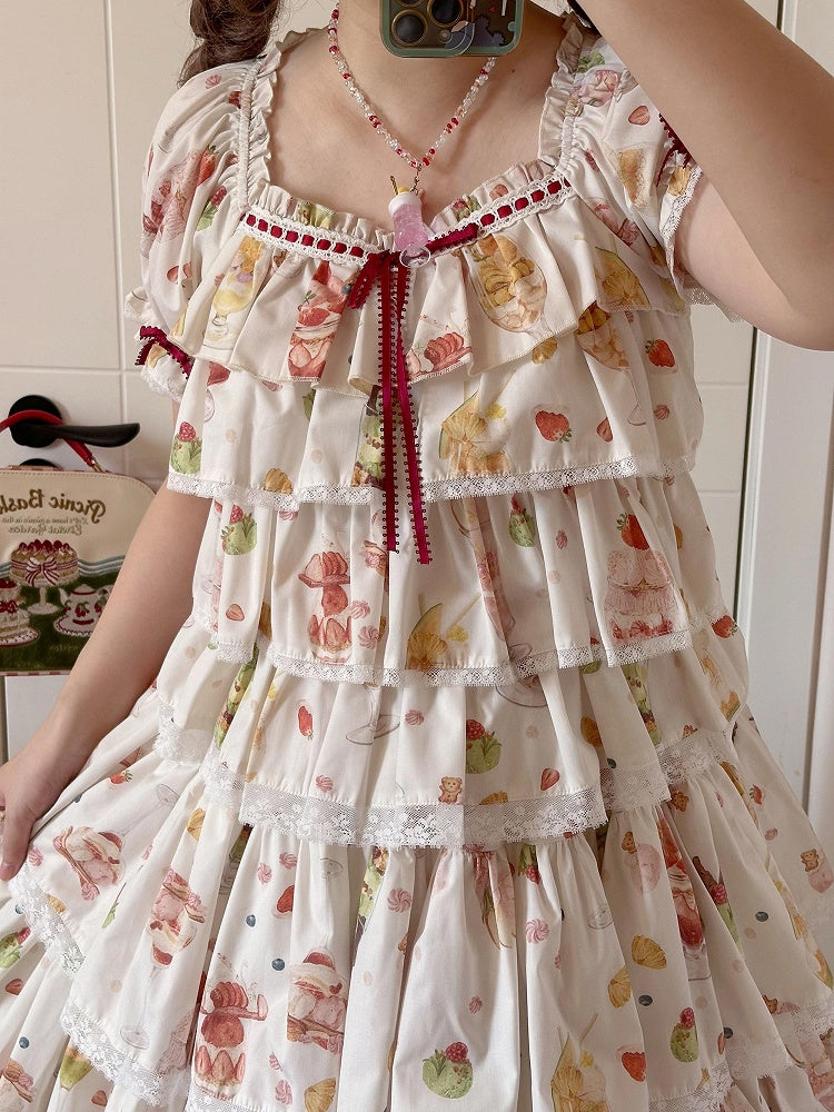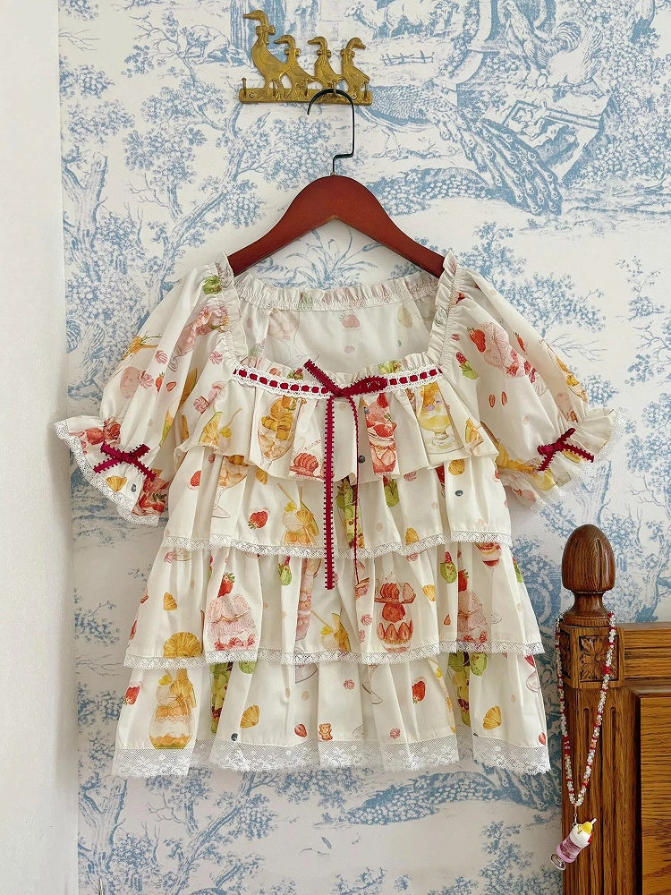 ショートパフェフルーツトップスリーブサマープリントクリーム