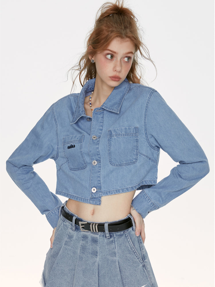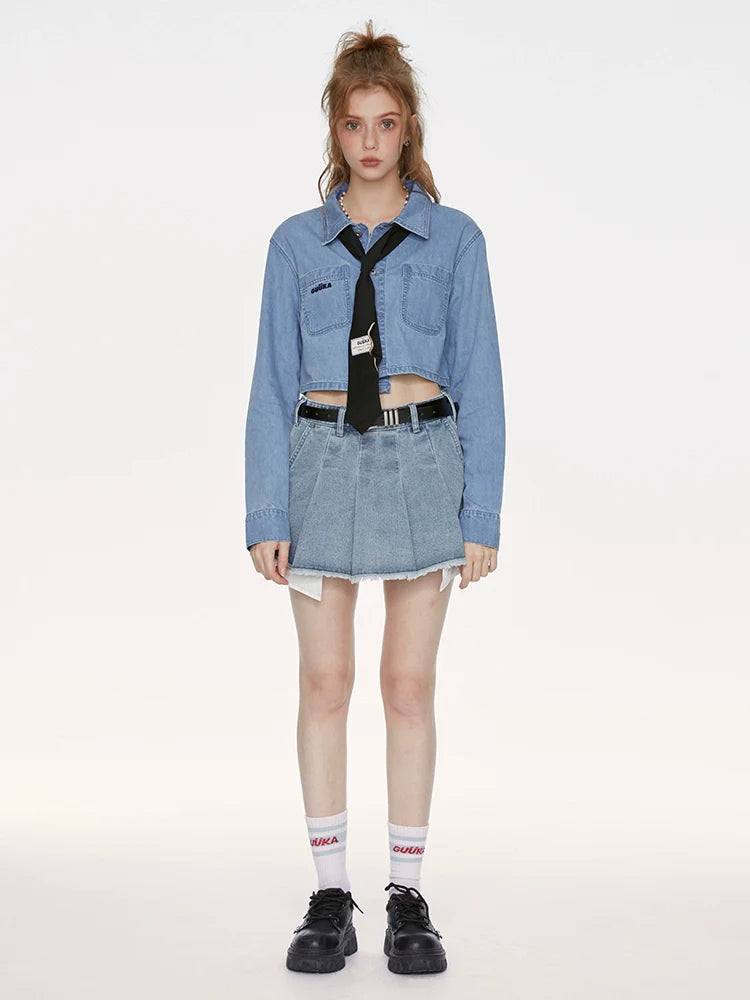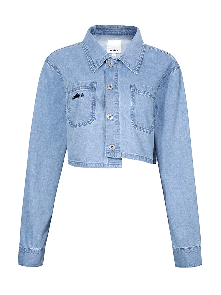 キュートなショート丈トップスは、アシンメトリーなデザインが魅力。上質なブルーデニムを使用。トレンド感と着心地を兼ね備えたこのユニークなアイテムは、どんなコーディネートにもスタイリッシュなアクセントを添えてくれます。カジュアルなお出かけにも、友達との楽しい夜にもぴったりです。