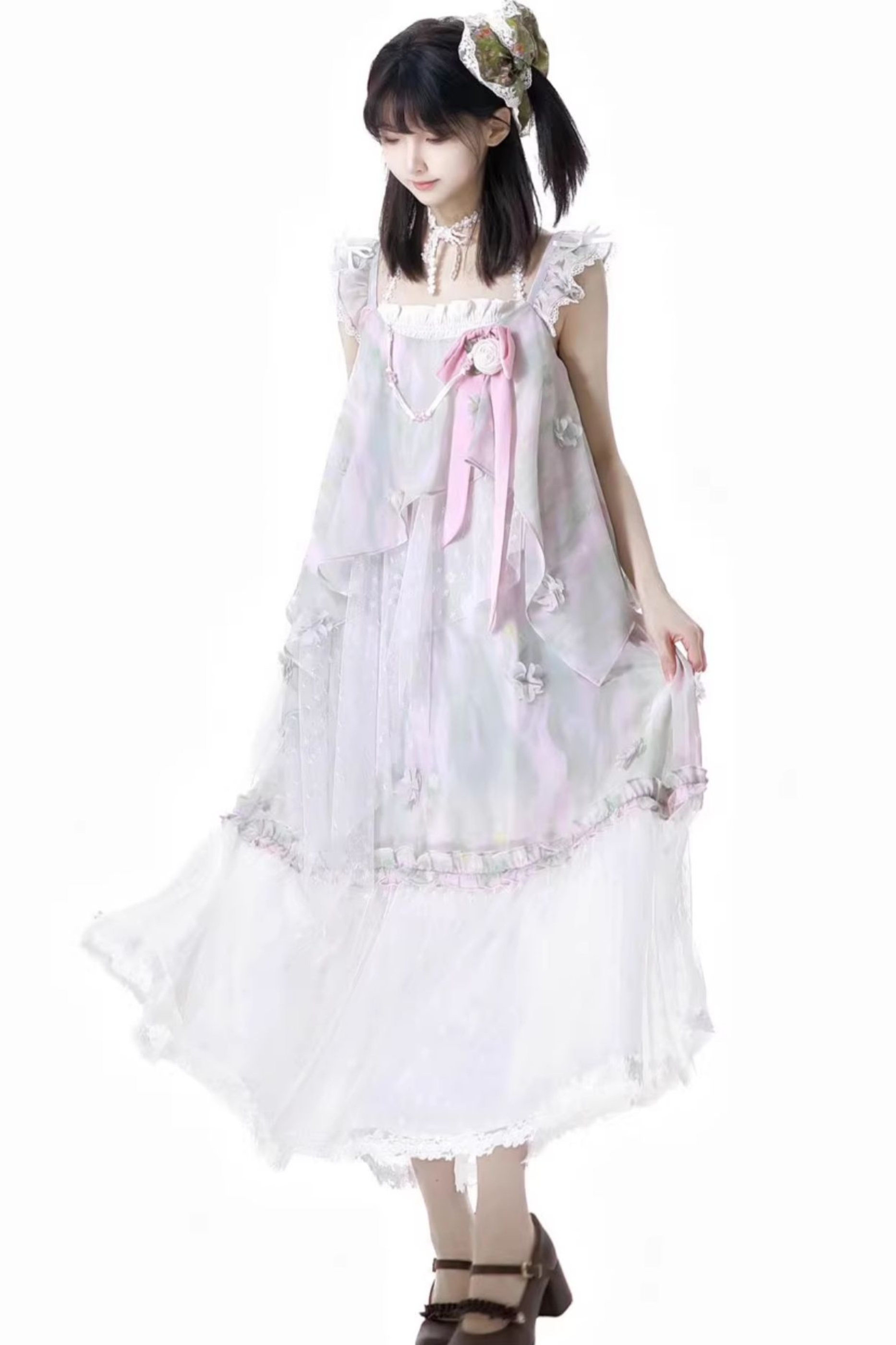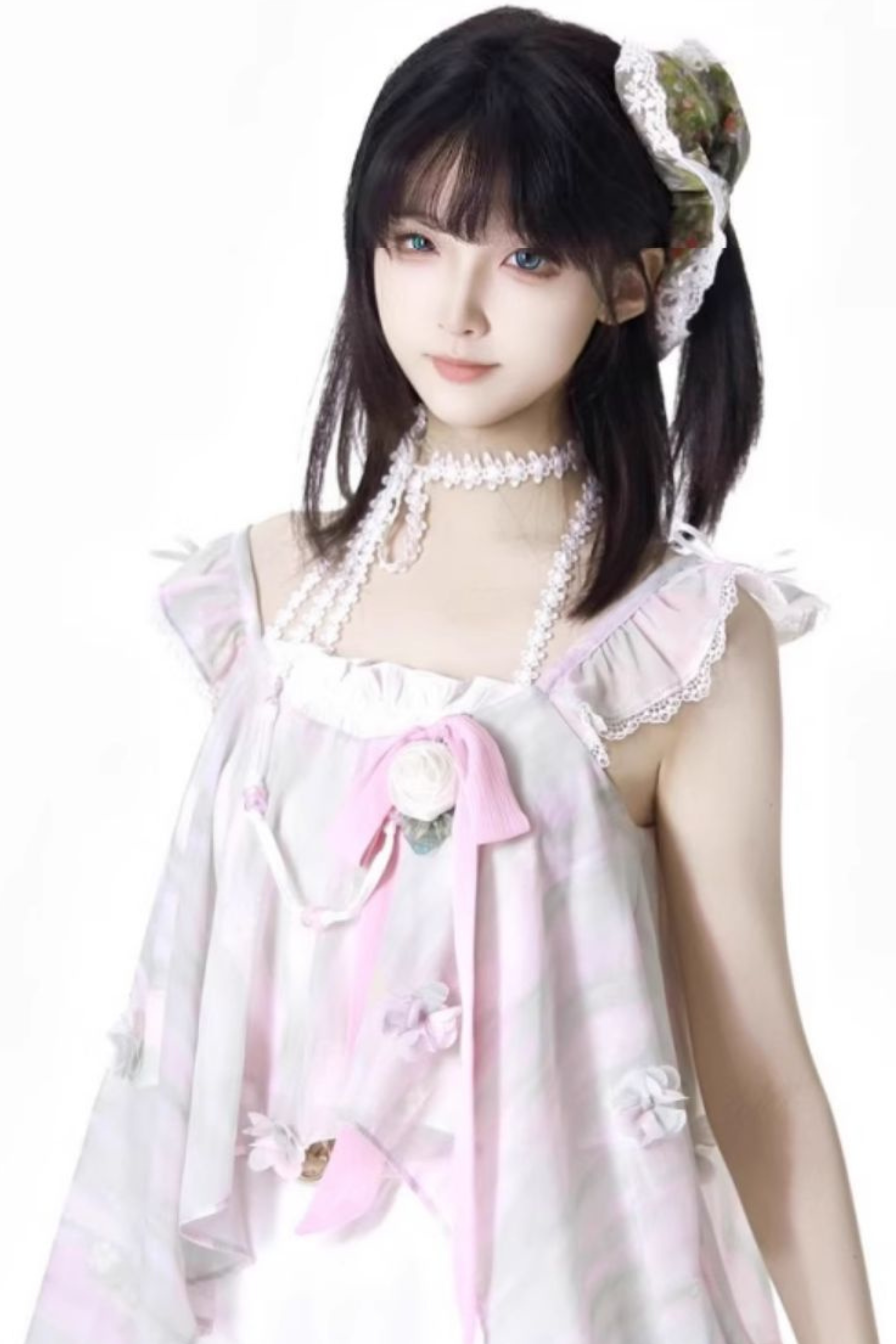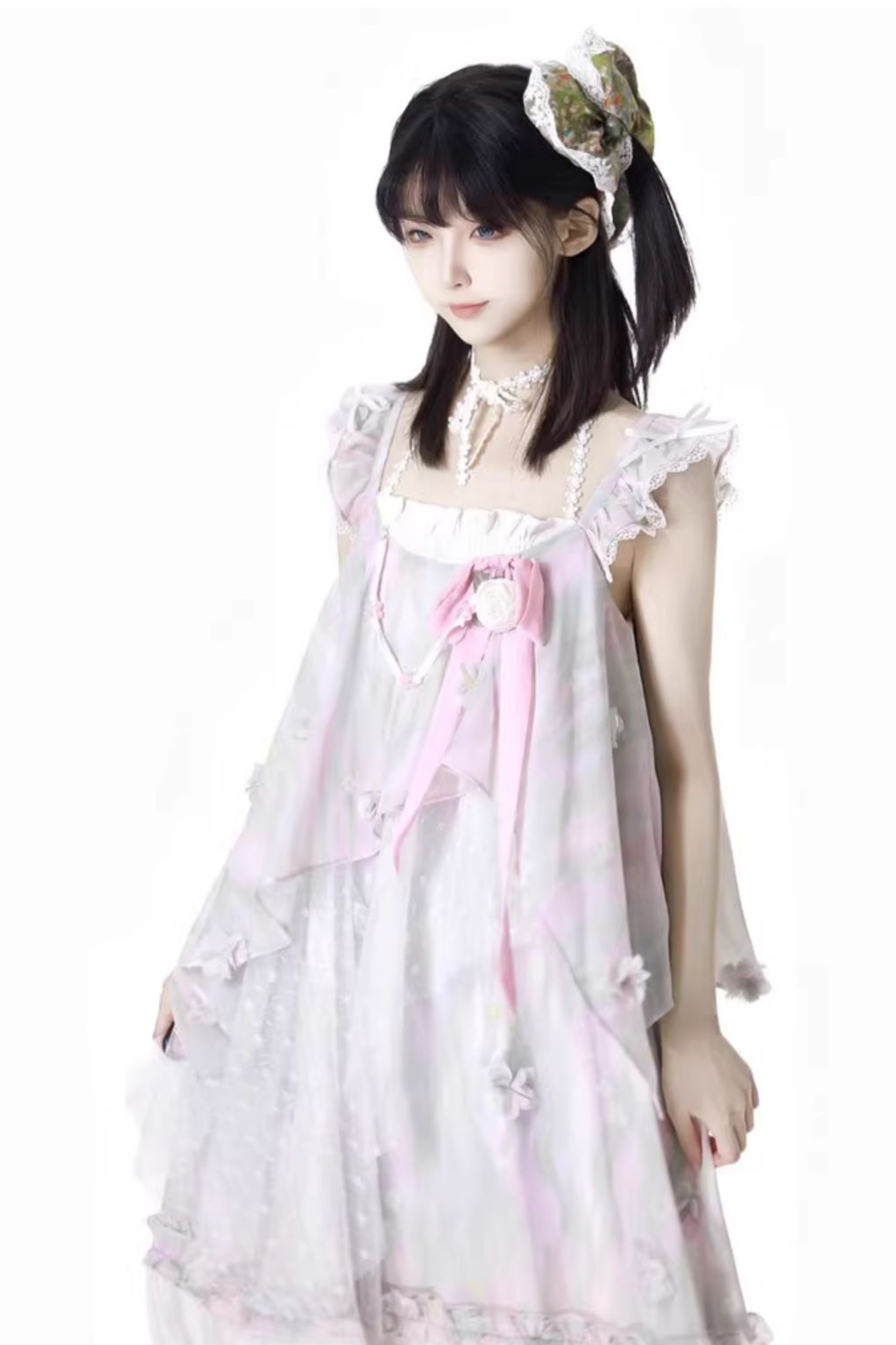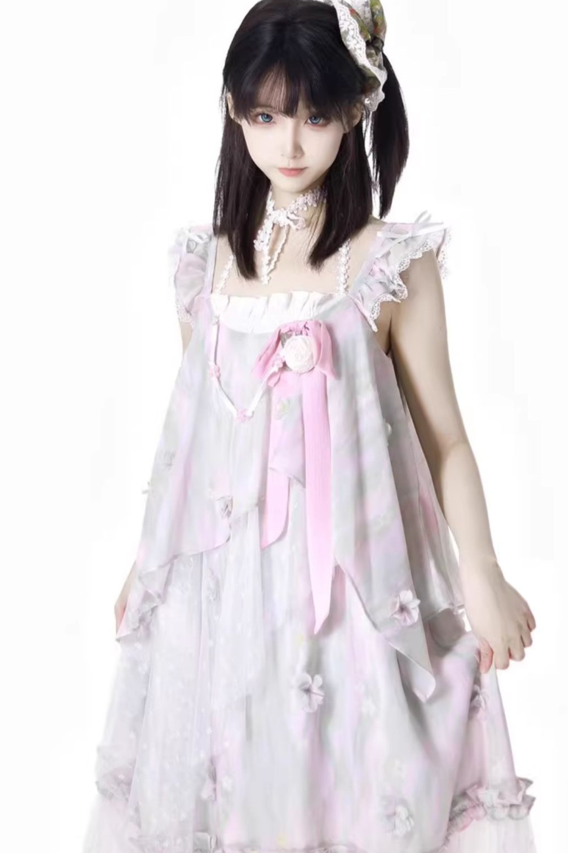 ピンクと白のオールドスクールロリータファッションドレス、蝶結びディテール、ロリータJSKセット