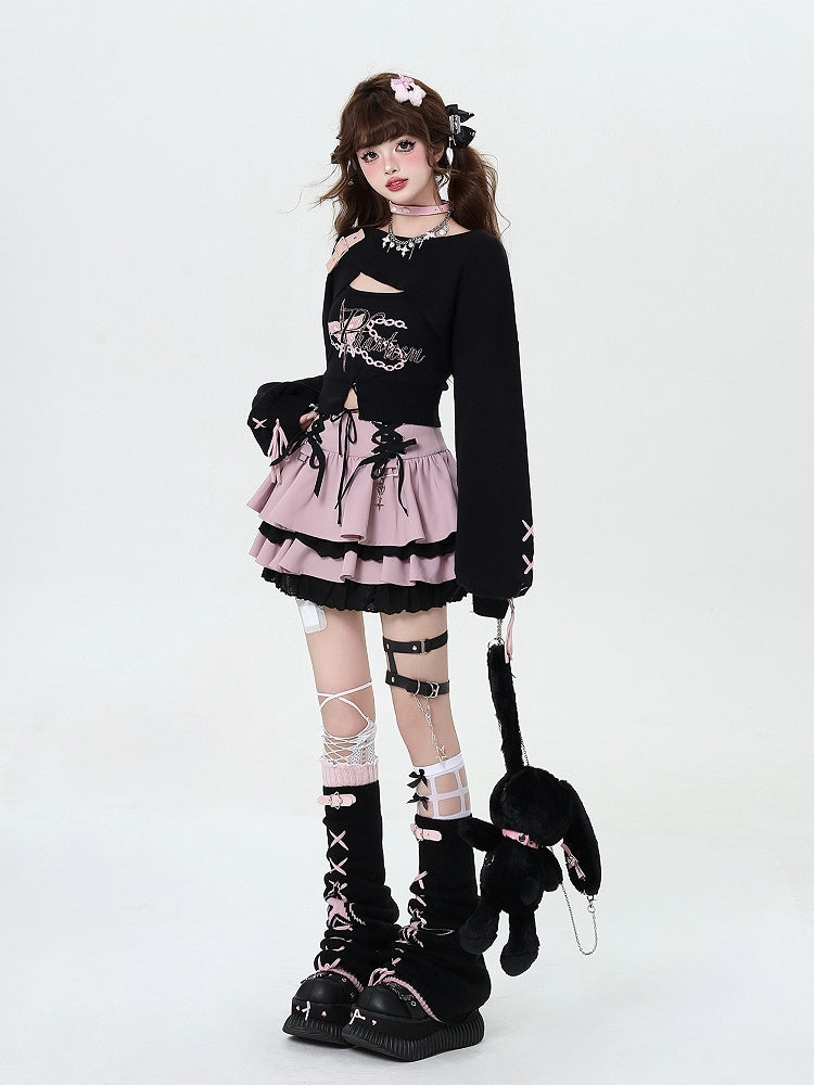 Sweet Spicy Black Knit Set: Cropped Shrug & Criss-cross Lace-Up Tank Top