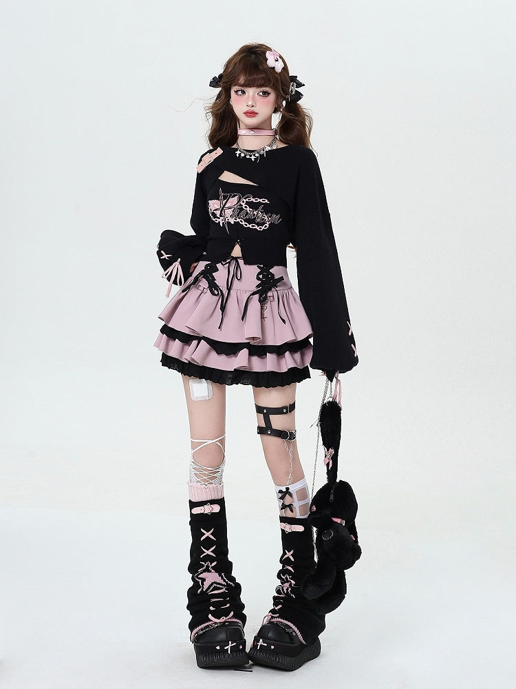 Shrug Knit Criss-cross Spicy Lace-Up Black Sweet Tank Set: Cropped Top