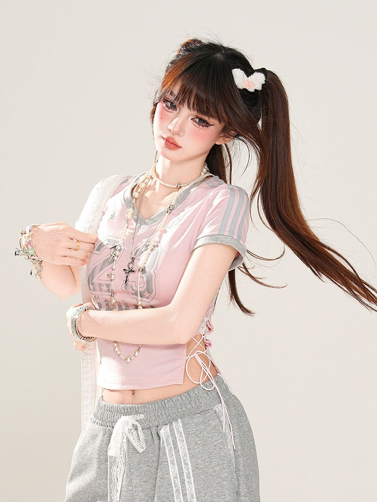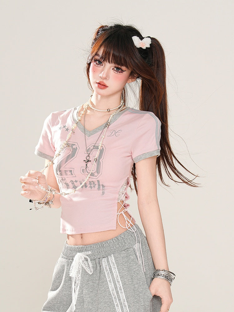 サイドにレースアッププリント、ピンクのVネックにナンバーディテールが入ったグラマラスなクロップドTシャツ