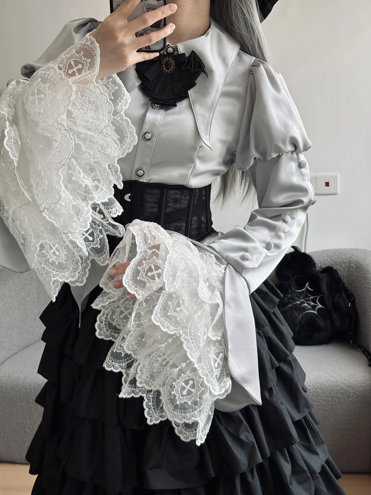 シルバーロリータスリーブ王子テールロングカラーフォールドオーバーポインテッドシャツ