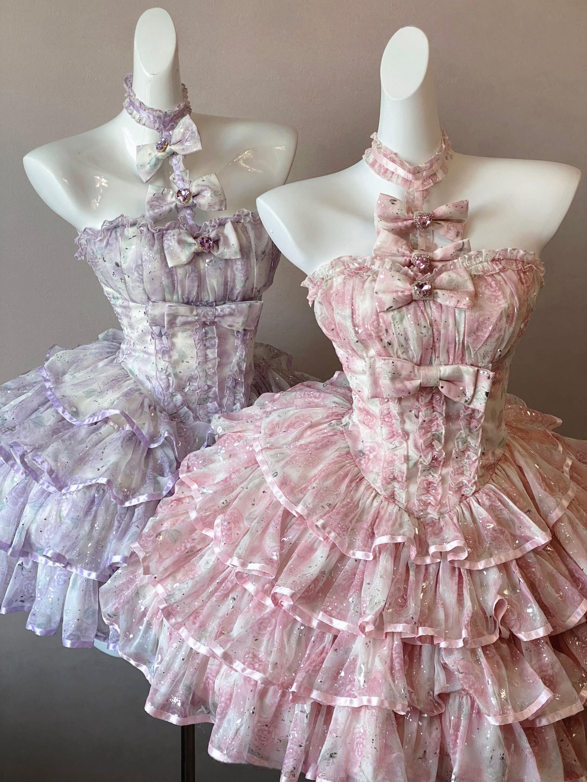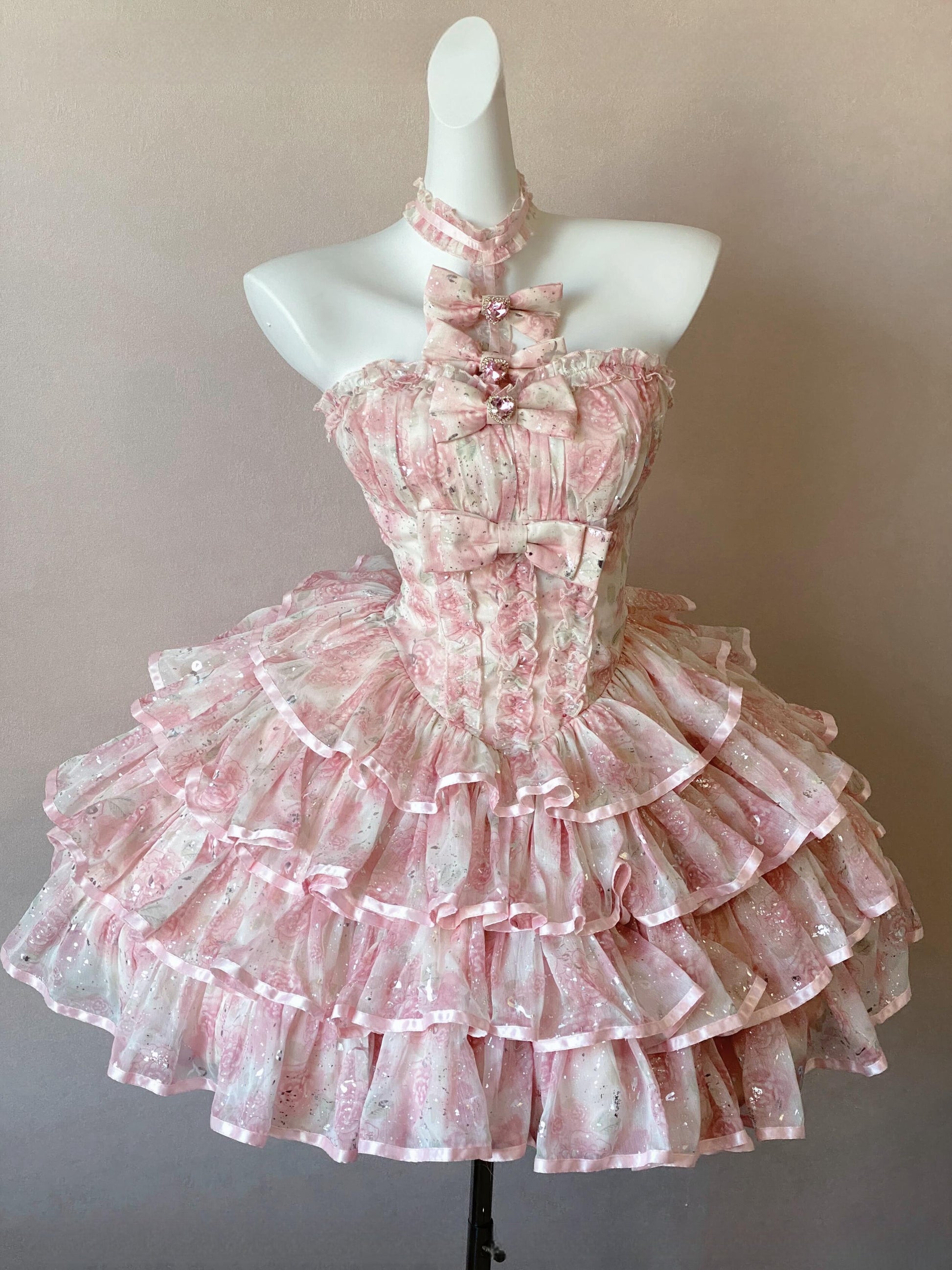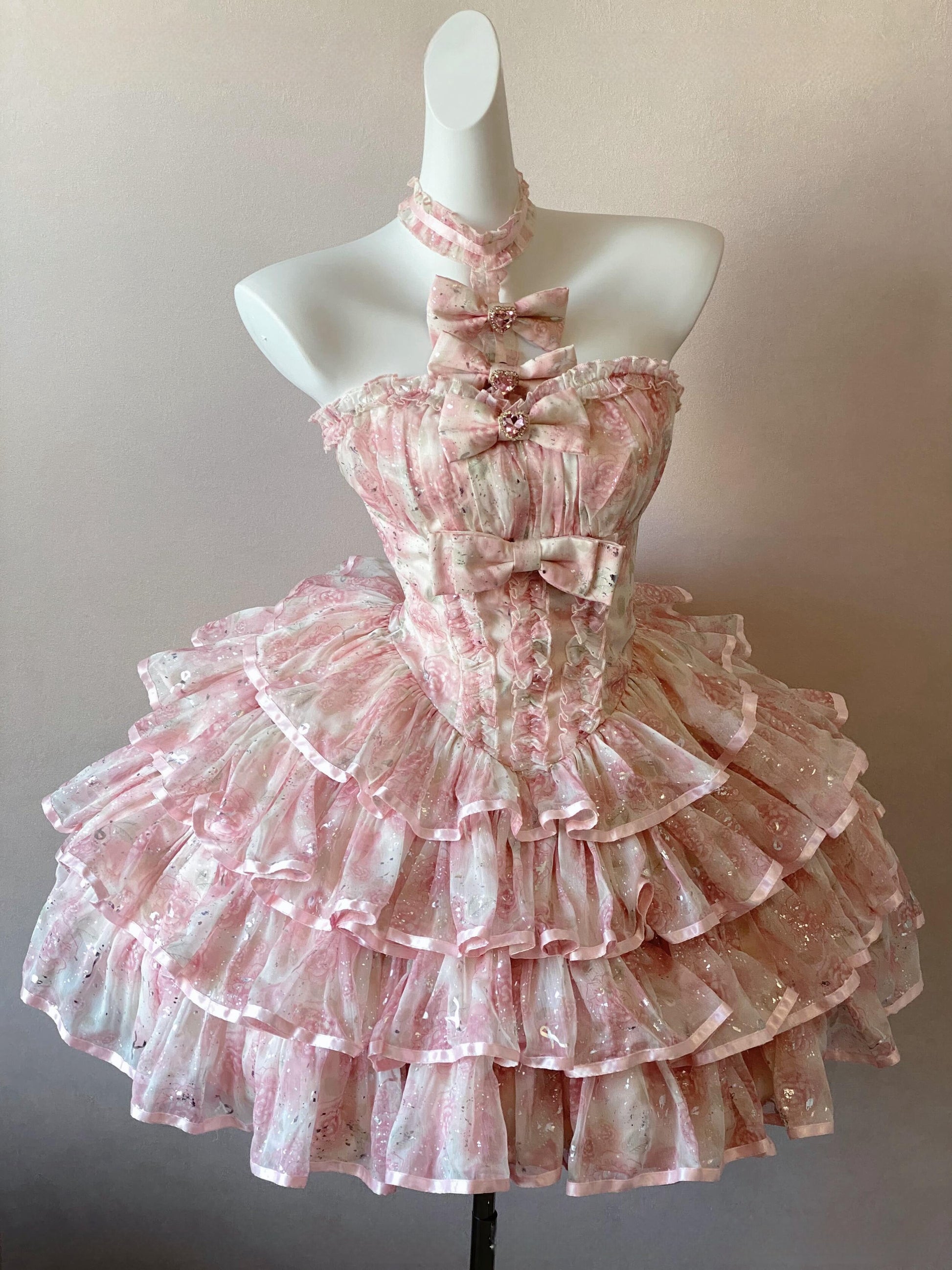 ピンクと白のオールドスクールロリータファッションドレス、蝶結びディテール、ロリータJSKセット