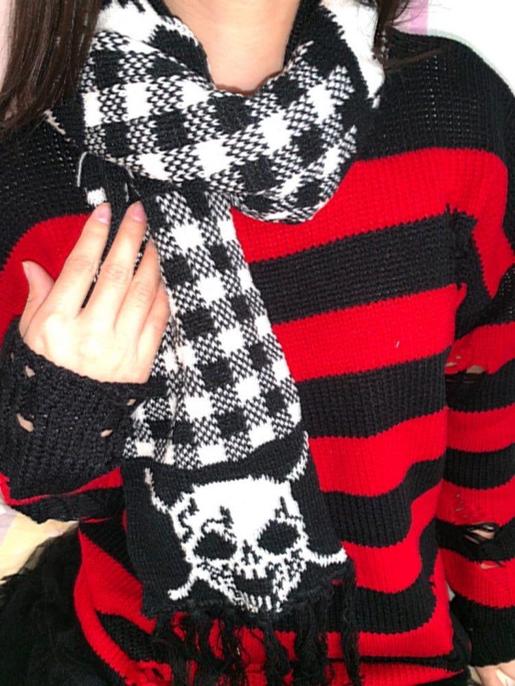愛らしくも不気味なスケルトンとチェック柄のタッセルスカーフで、装いを華やかに演出しましょう。ユニークなデザインと遊び心のあるタッセルが、どんな装いにもぴったりのステートメントピースです。このマストハブアイテムで、暖かくスタイリッシュに過ごしましょう。