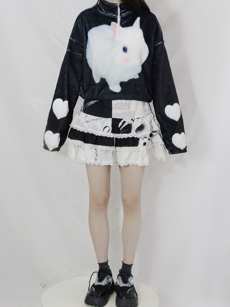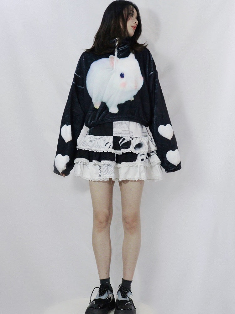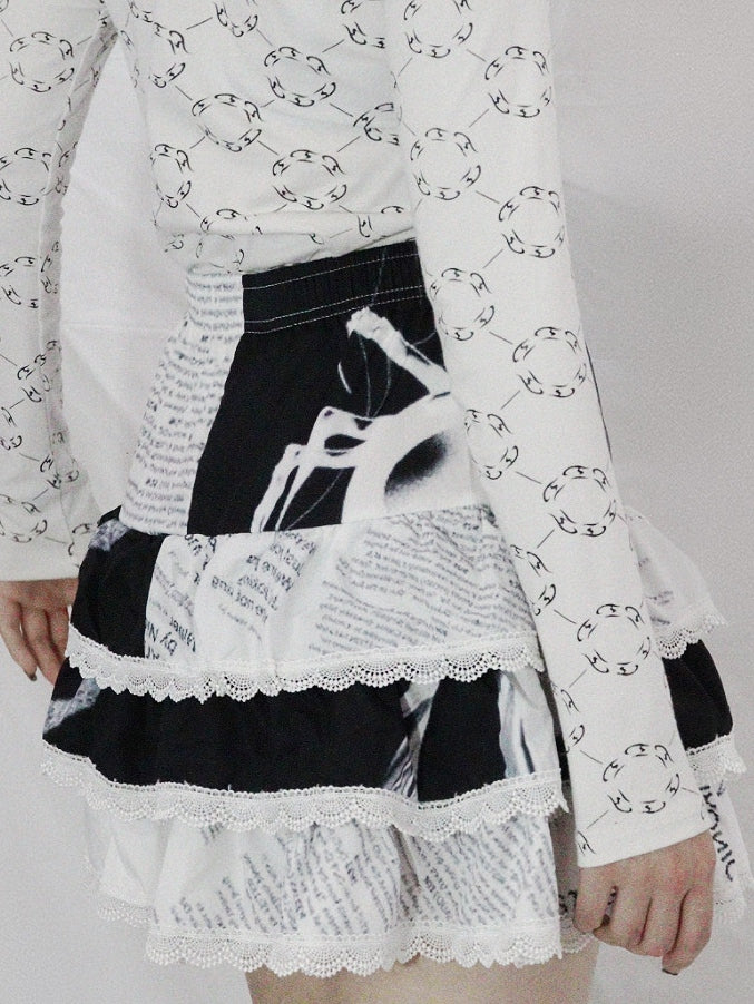 スカートとレース付きギャルファッションティアードホワイト/ピンクブラックトリムプリントスパイダーレター