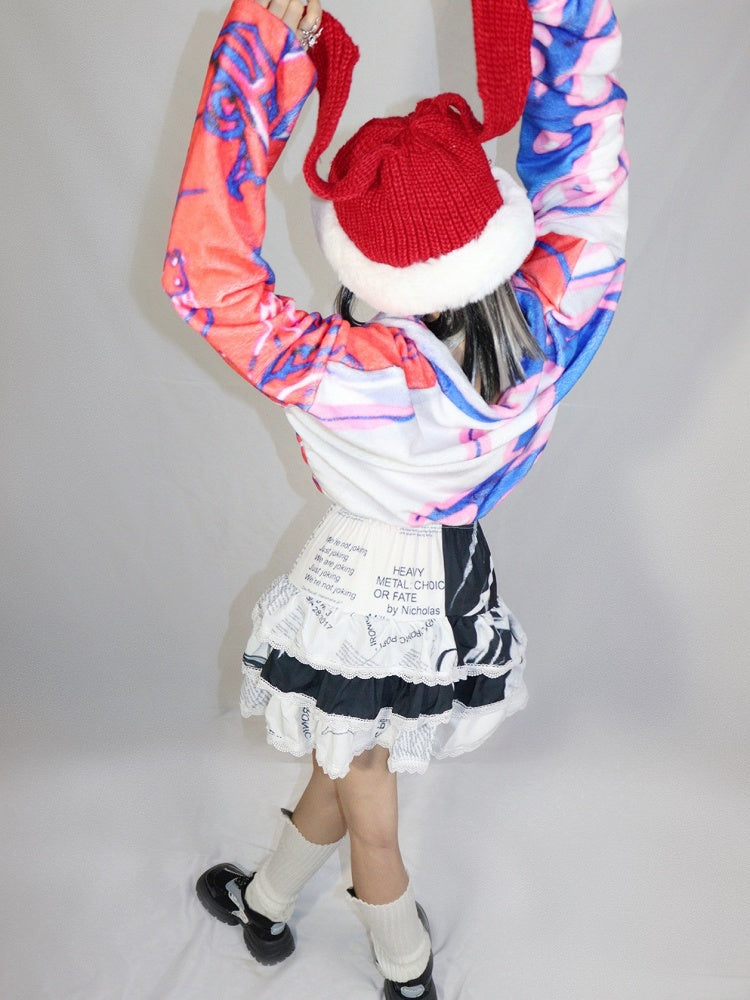 ホワイト/ピンク&ブラックのギャルファッション、スパイダーとレタープリントのレーストリム付きティアードスカート