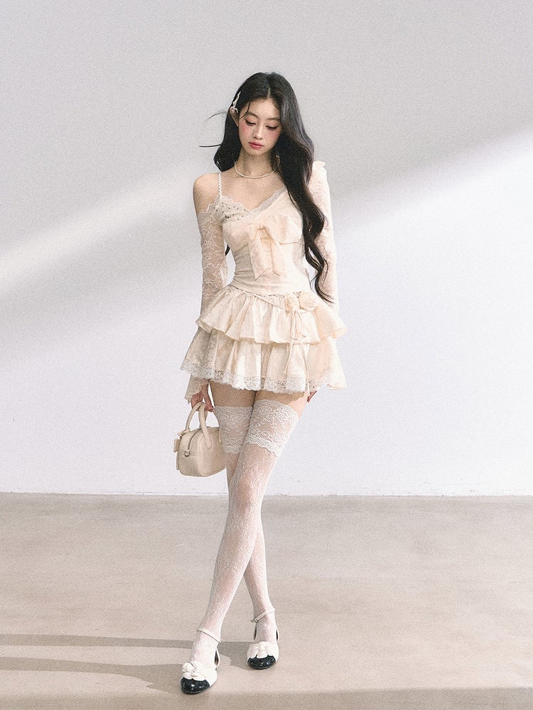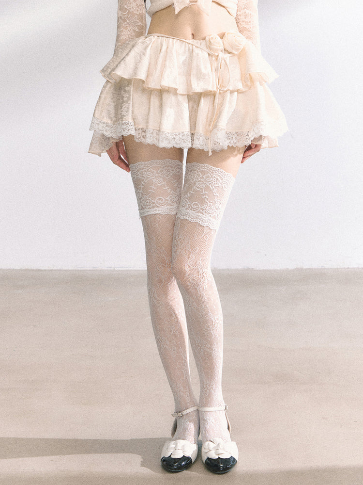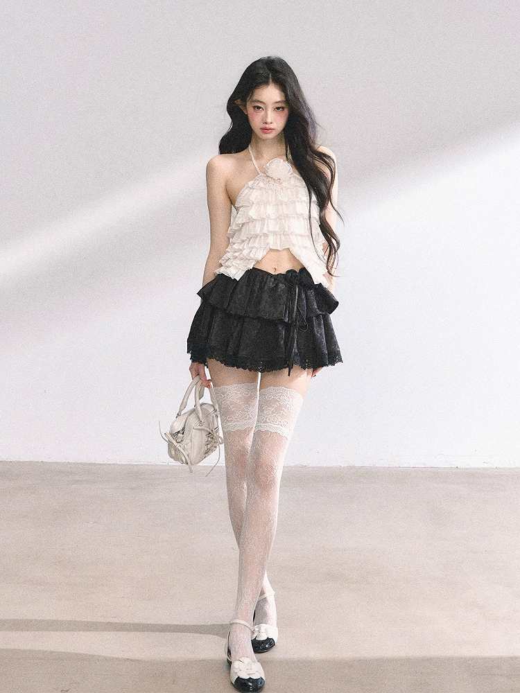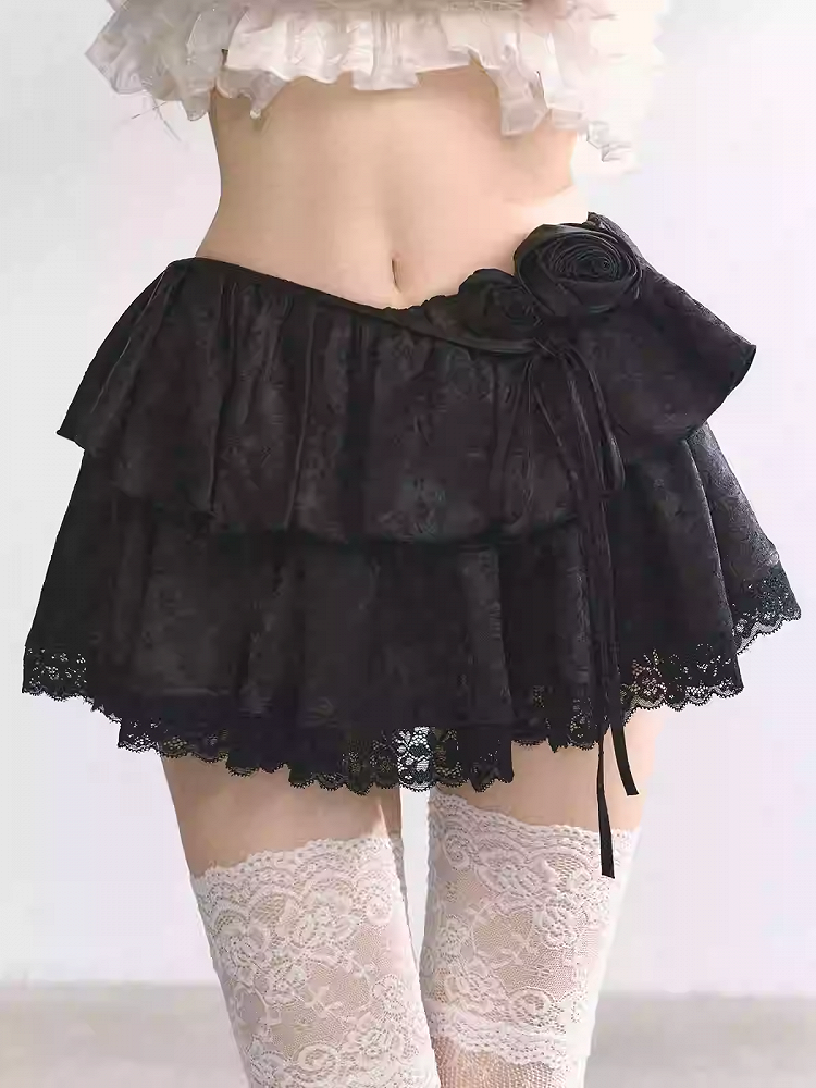 ブラック/アプリコット 伸縮性ウエスト レーストリム 花柄 ティアードミニスカート