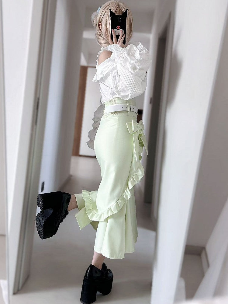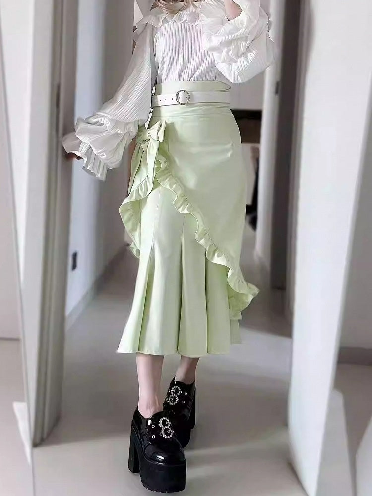 グリーンジライケイちょう結び装飾フリルトリムマーメイドスカート