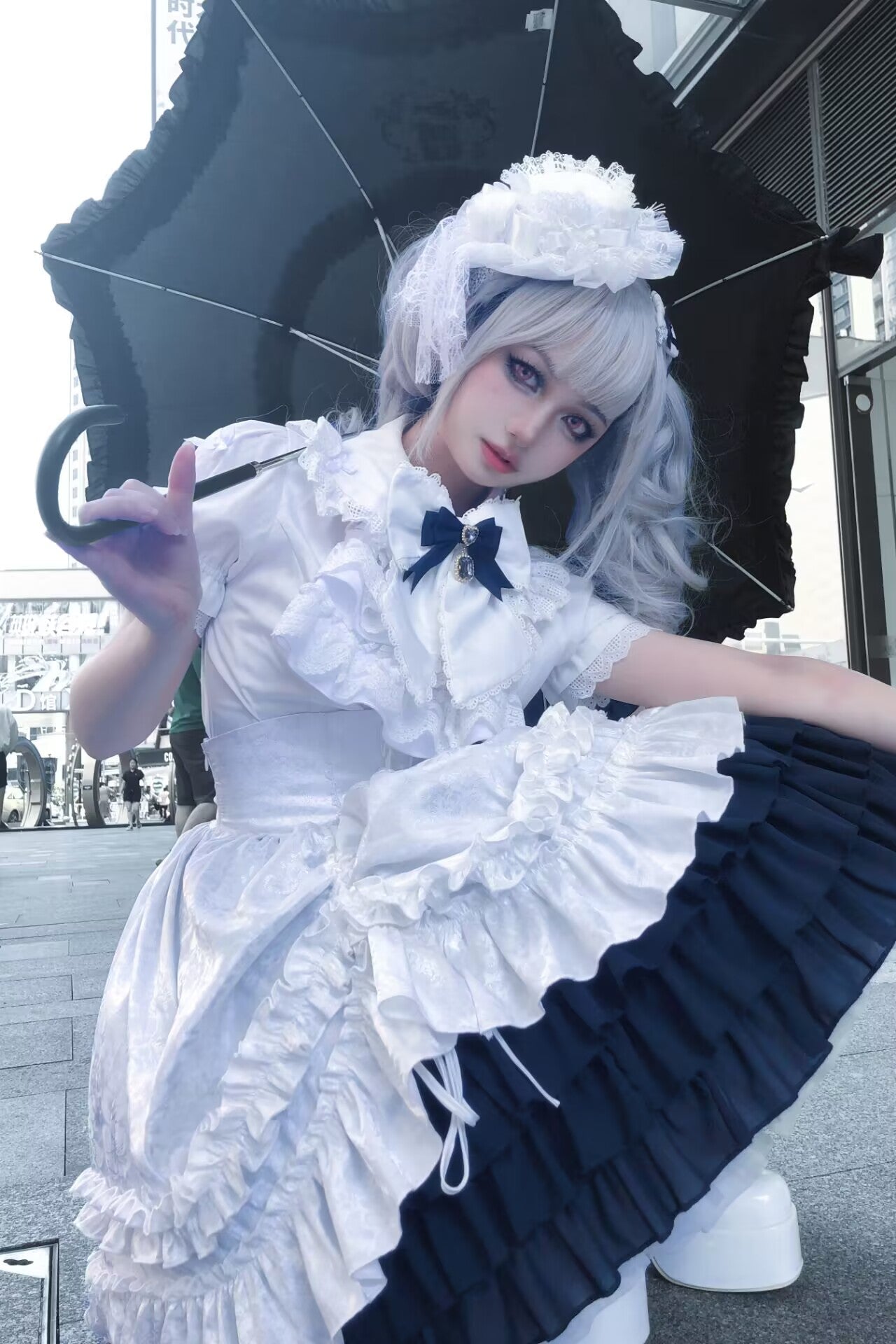 青と白のオールドスクールロリータファッションドレス 蝶結びディテール JSK セット