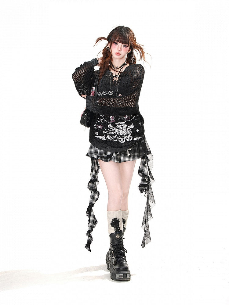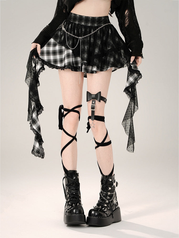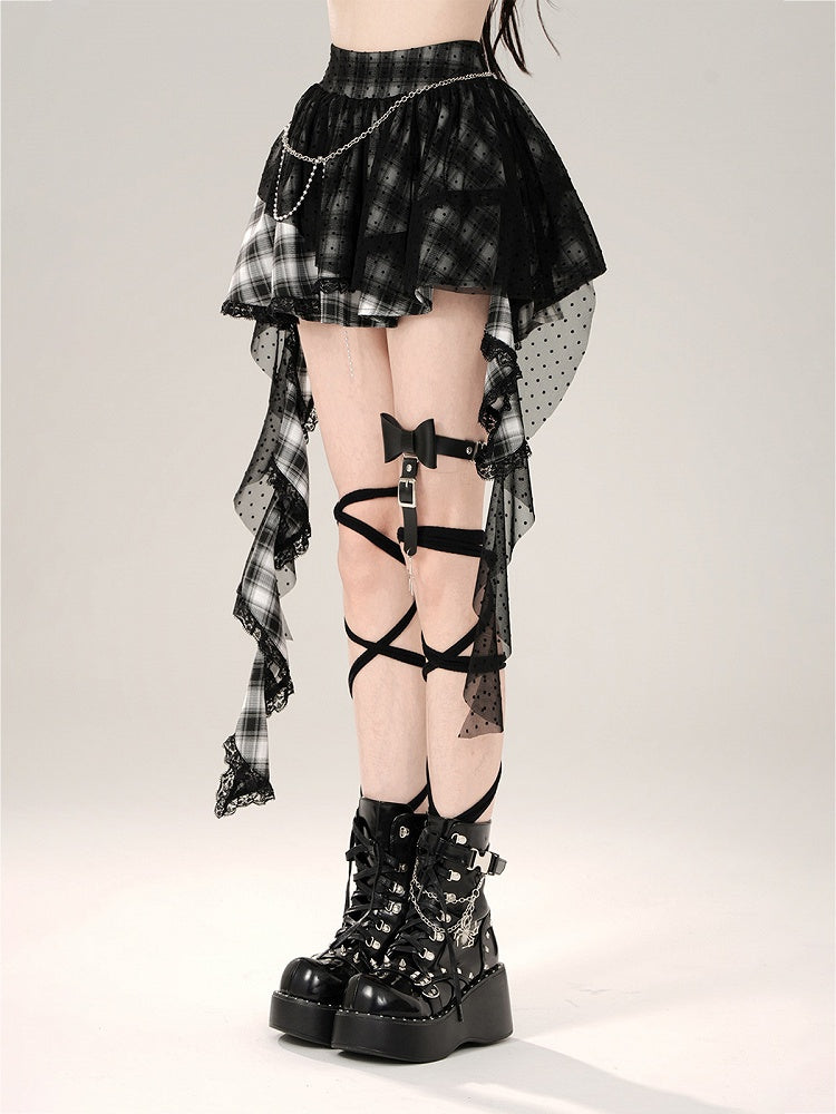 スカート裾は非対称メッシュパッチワークデザイン、ブラックのチェック柄、フリル付き水玉模様