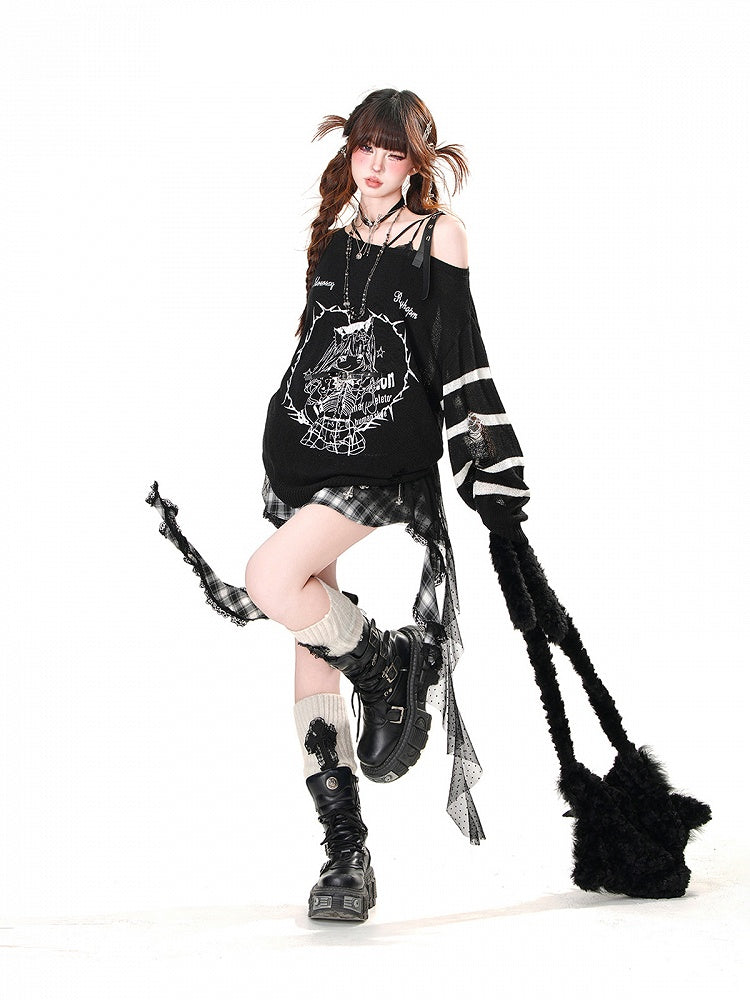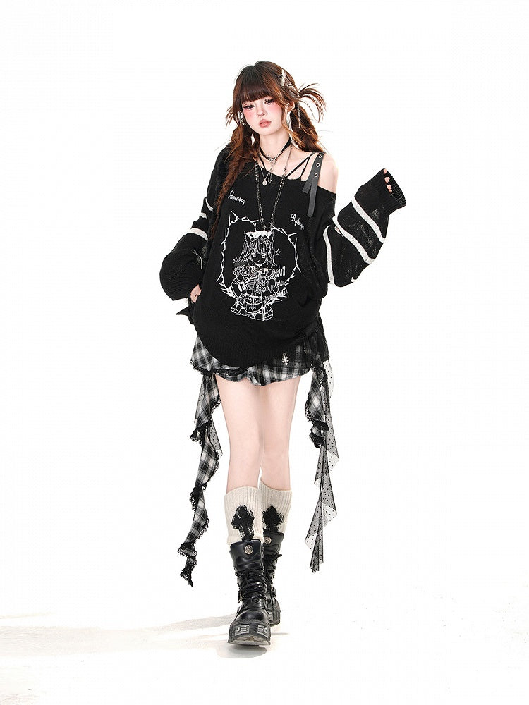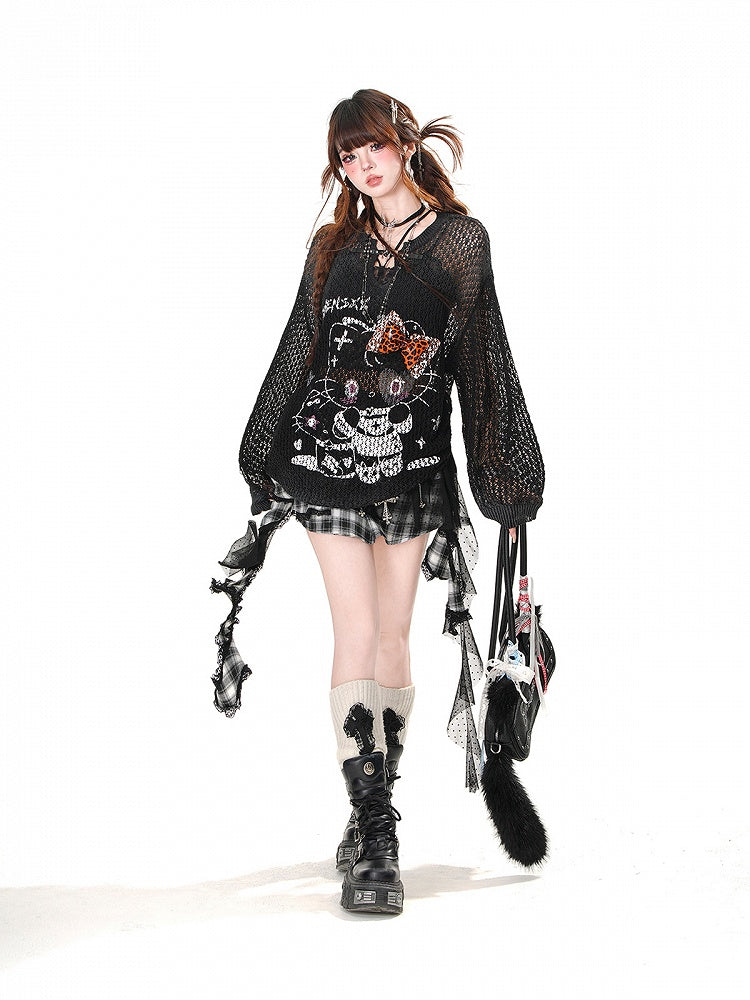 このキュートなスカートは、ユニークなアシンメトリーのメッシュパッチワークデザインに、黒のチェック柄とフリルの水玉模様のアクセントが効いています。遊び心とスタイリッシュさを兼ね備えた万能アイテムです。