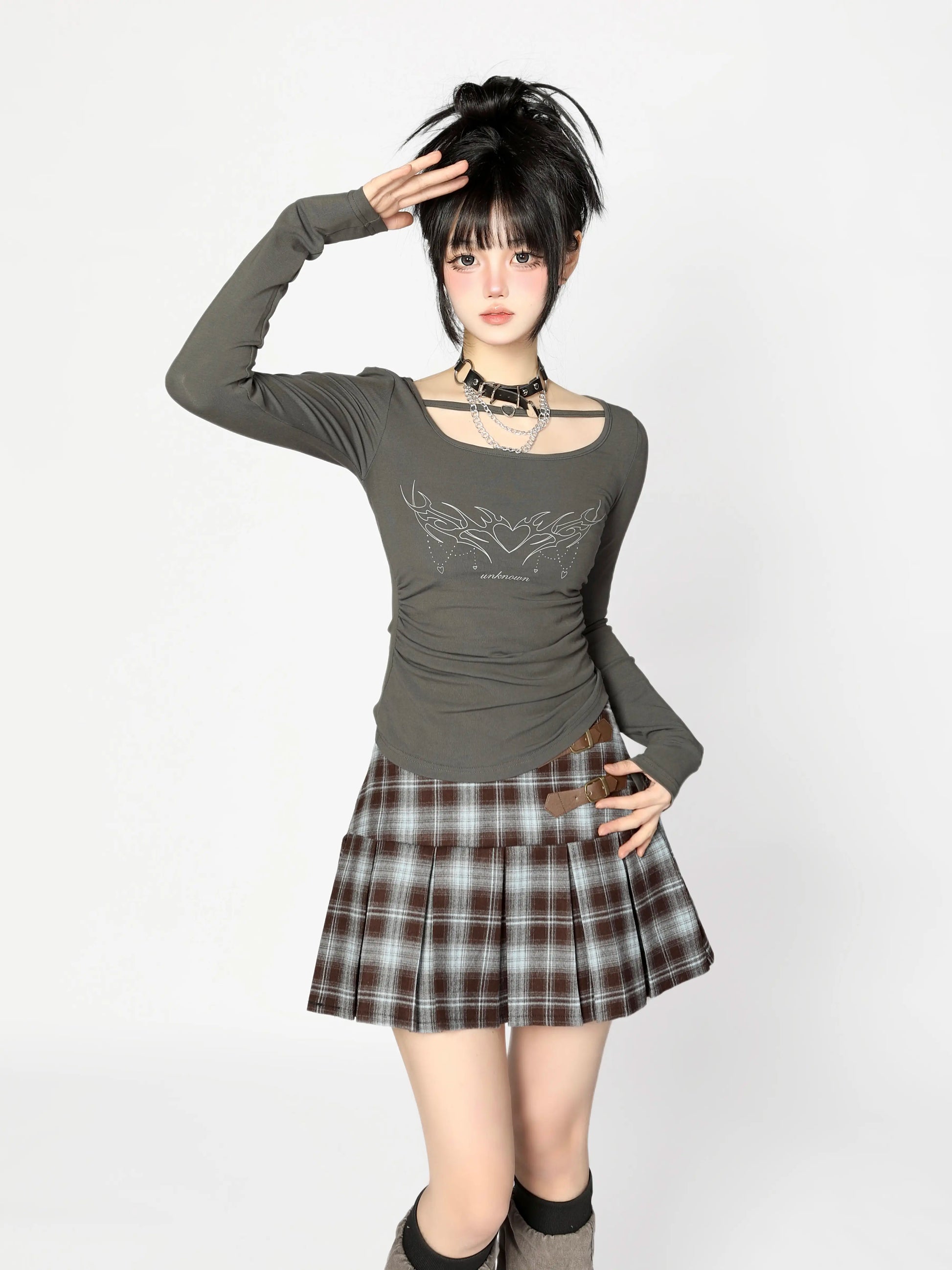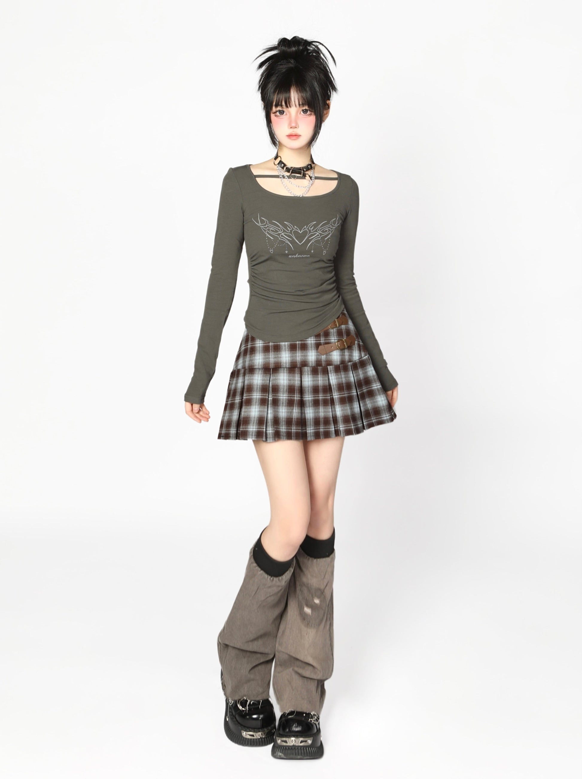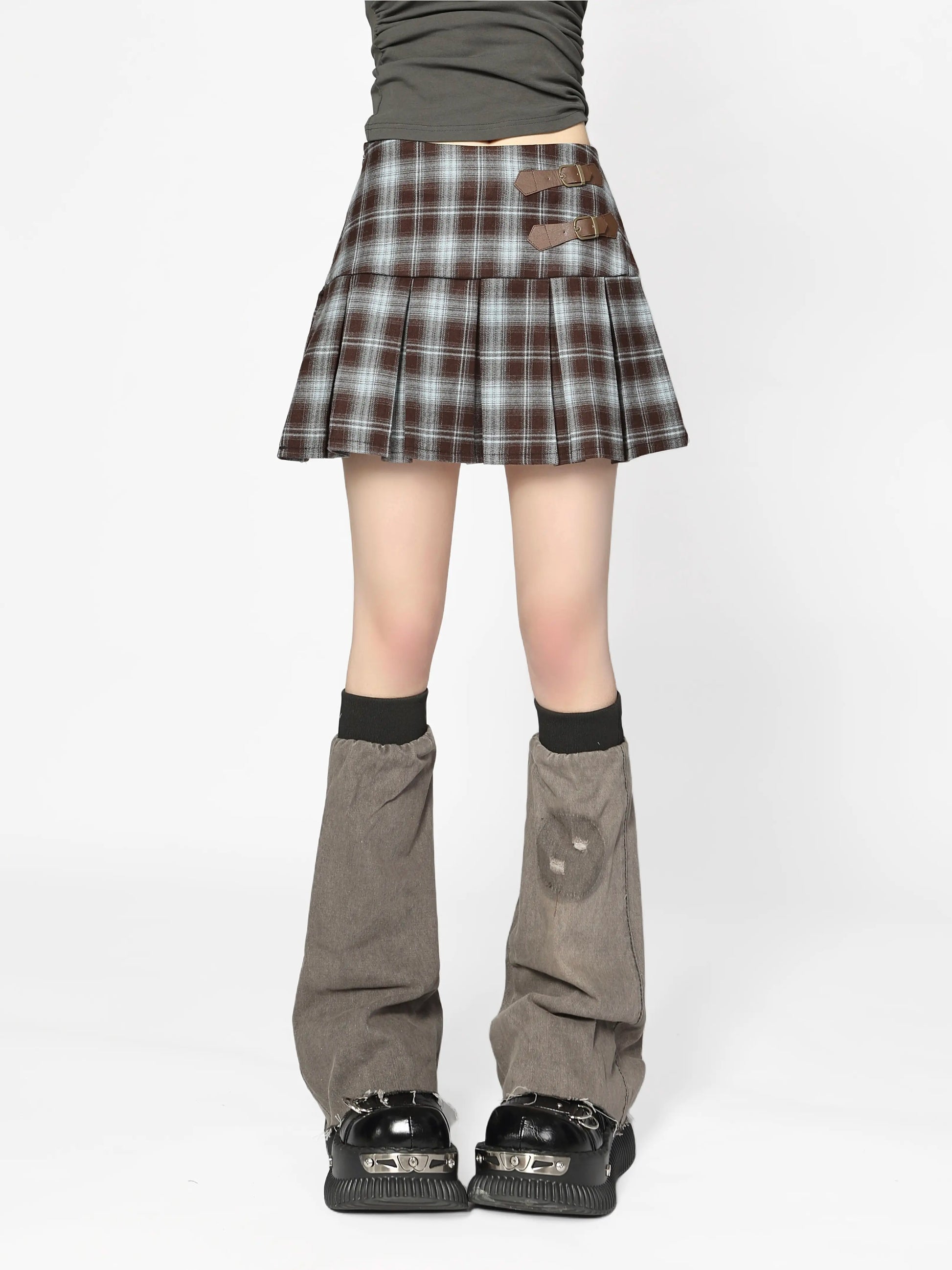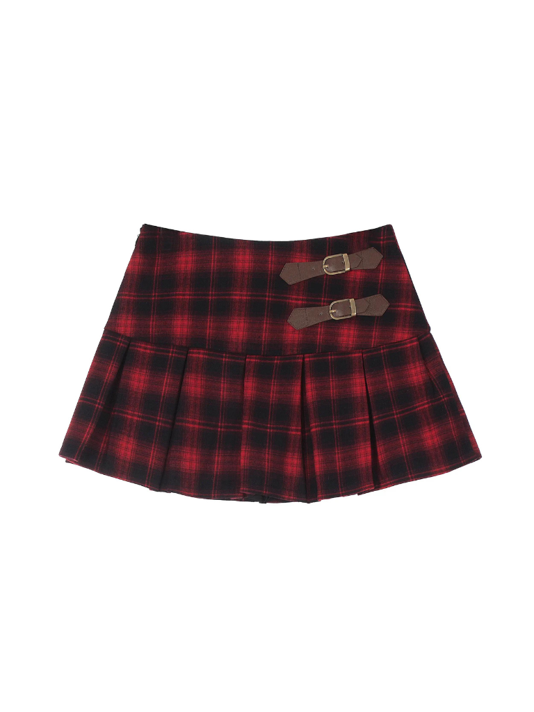 チェック柄、ダークレザー素材、プリーツデザインが特徴のキュートなパンク風スカート。バックルディテールでスタイルアップ効果も。エッジの効いた遊び心のあるルックにぴったりです。