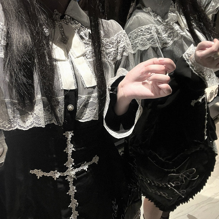 Skirt Rose Cross Landmine White/Black/Pink Embroidery Jirai Hem High Style Kei Lace Waist