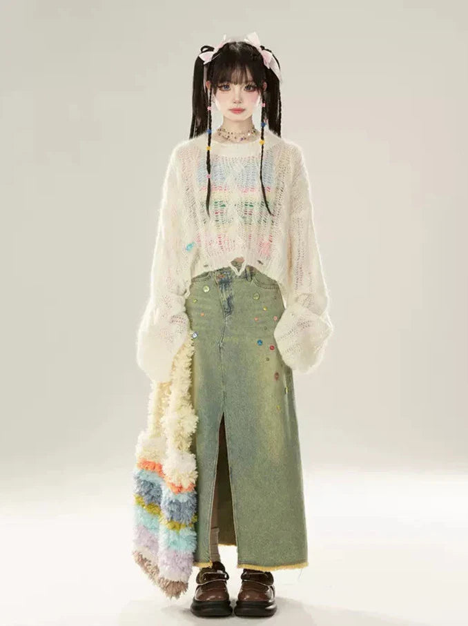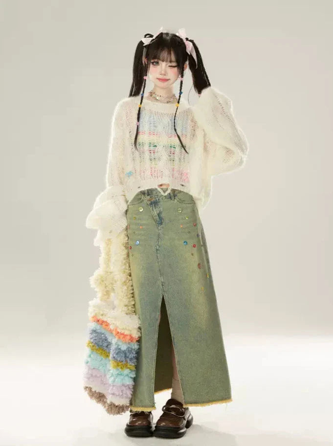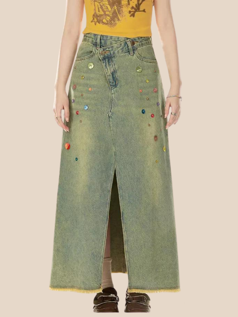 愛され続けるスカートスリットスパンコールデニムのご紹介です!スタイリッシュなスリットとキラキラ輝くスパンコールが特徴のデニムスカートは、どんなシーンにもぴったり。毎日の装いに華やかさをプラスしてくれる、目を引く一枚でワードローブをグレードアップ。