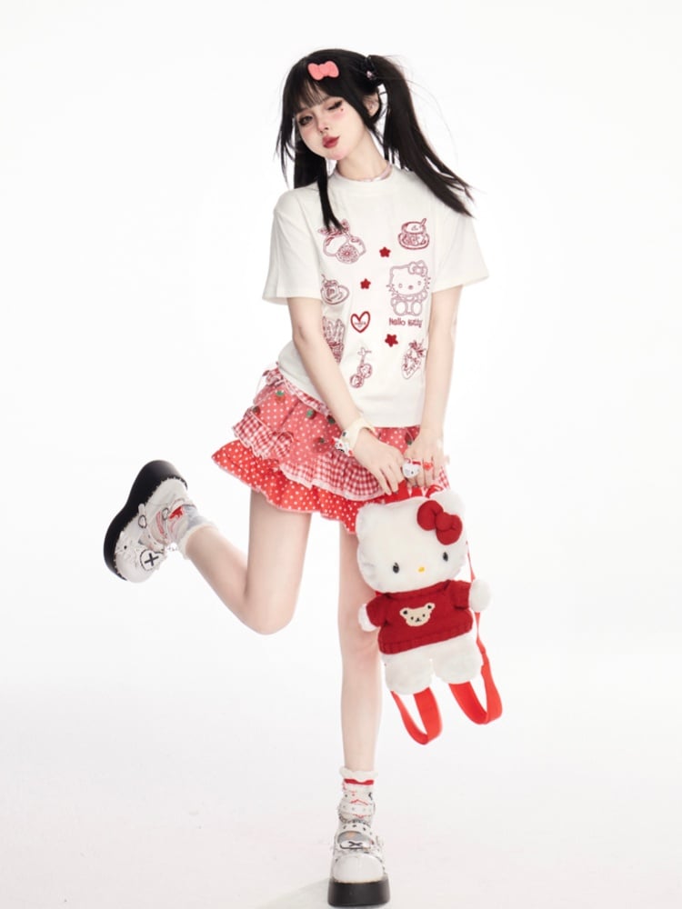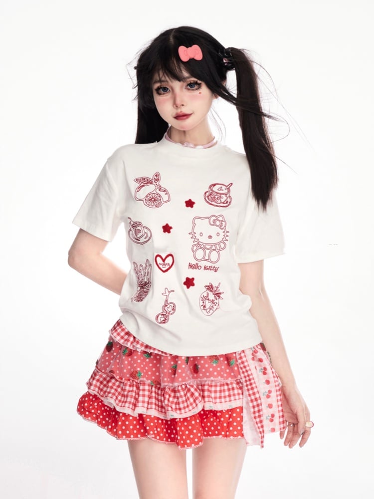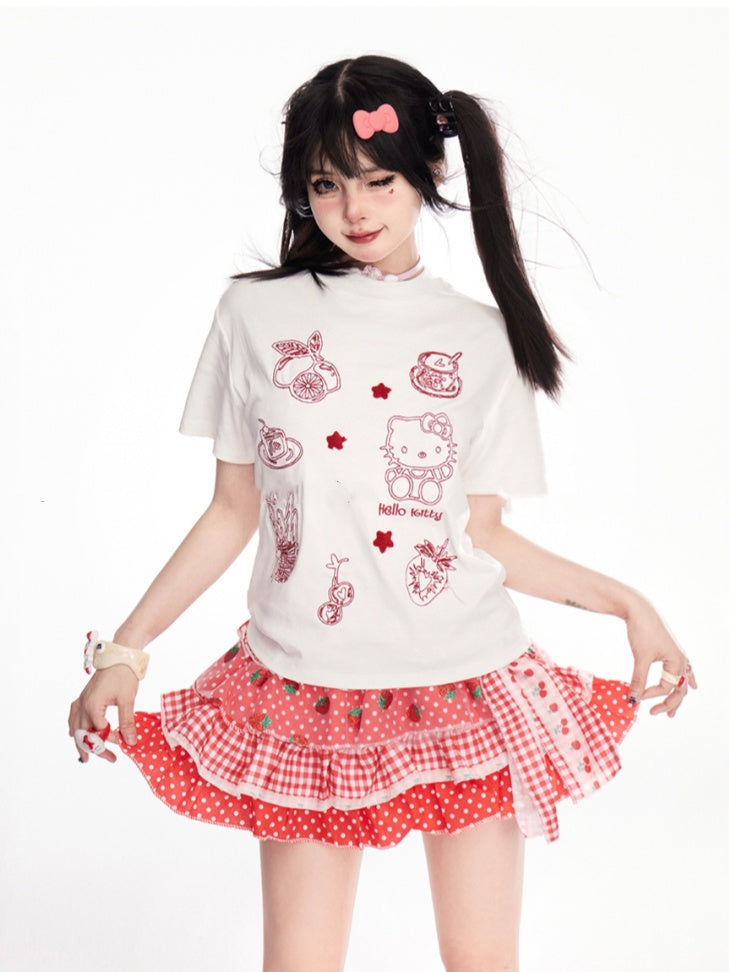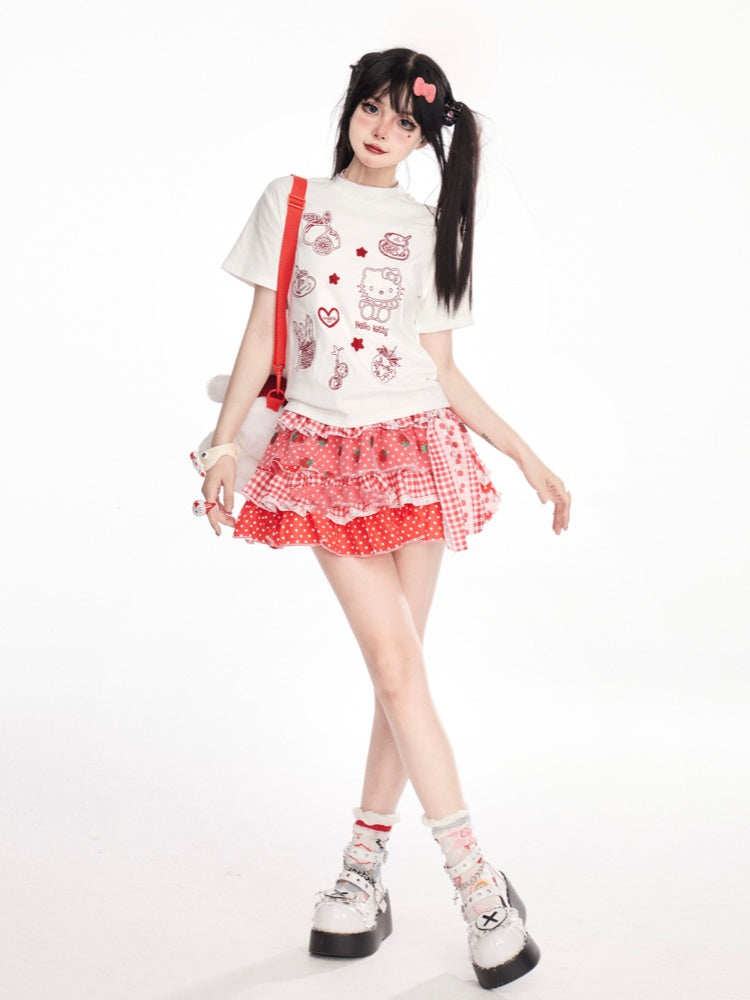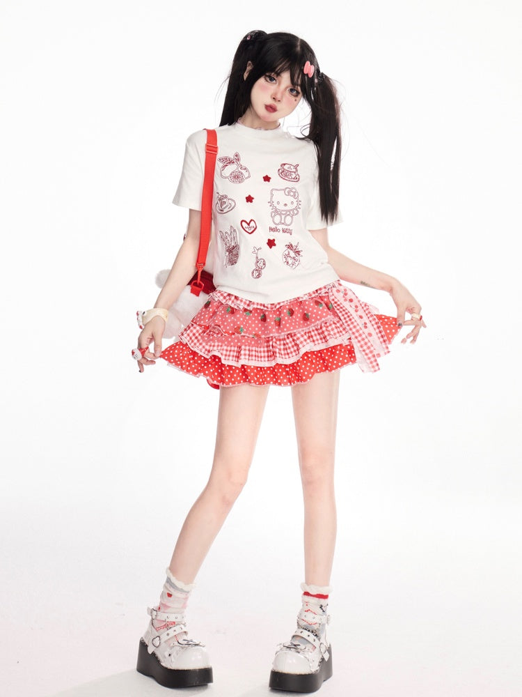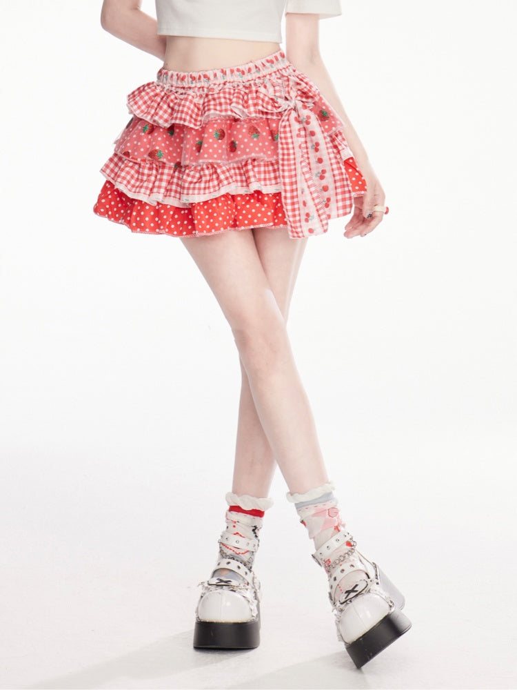 赤いチェック柄のスイートな水玉模様のティアードストロベリースカート