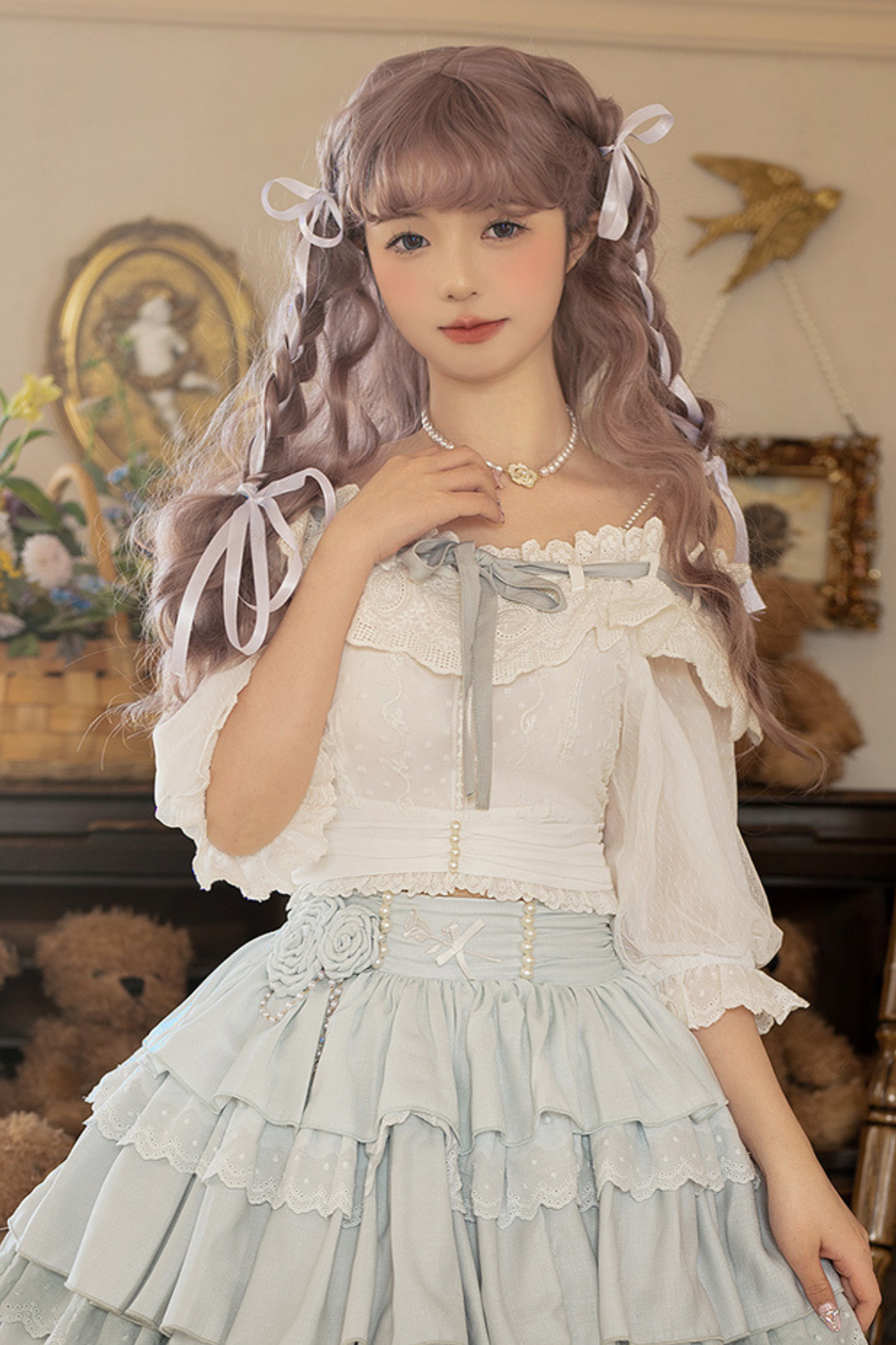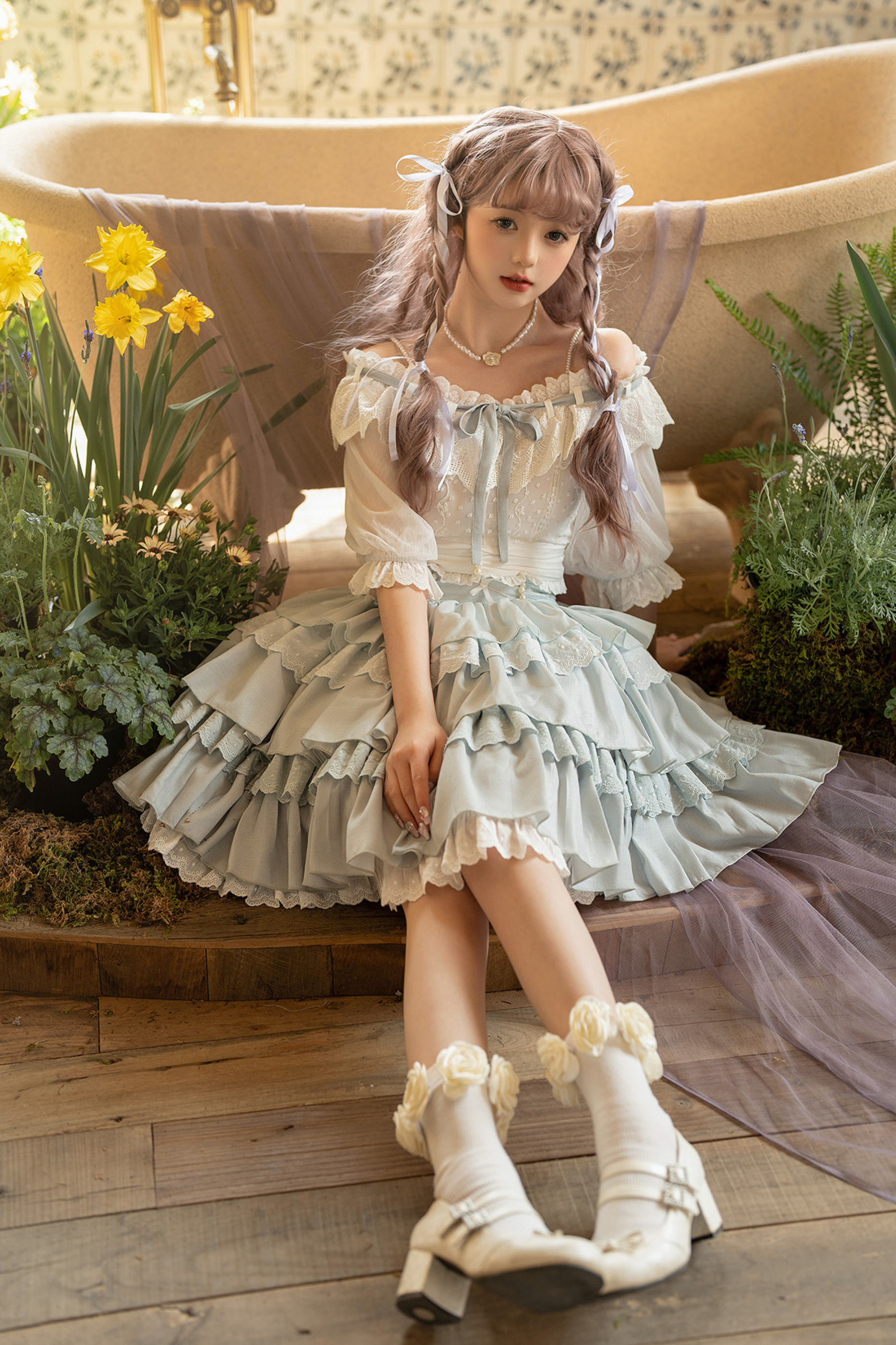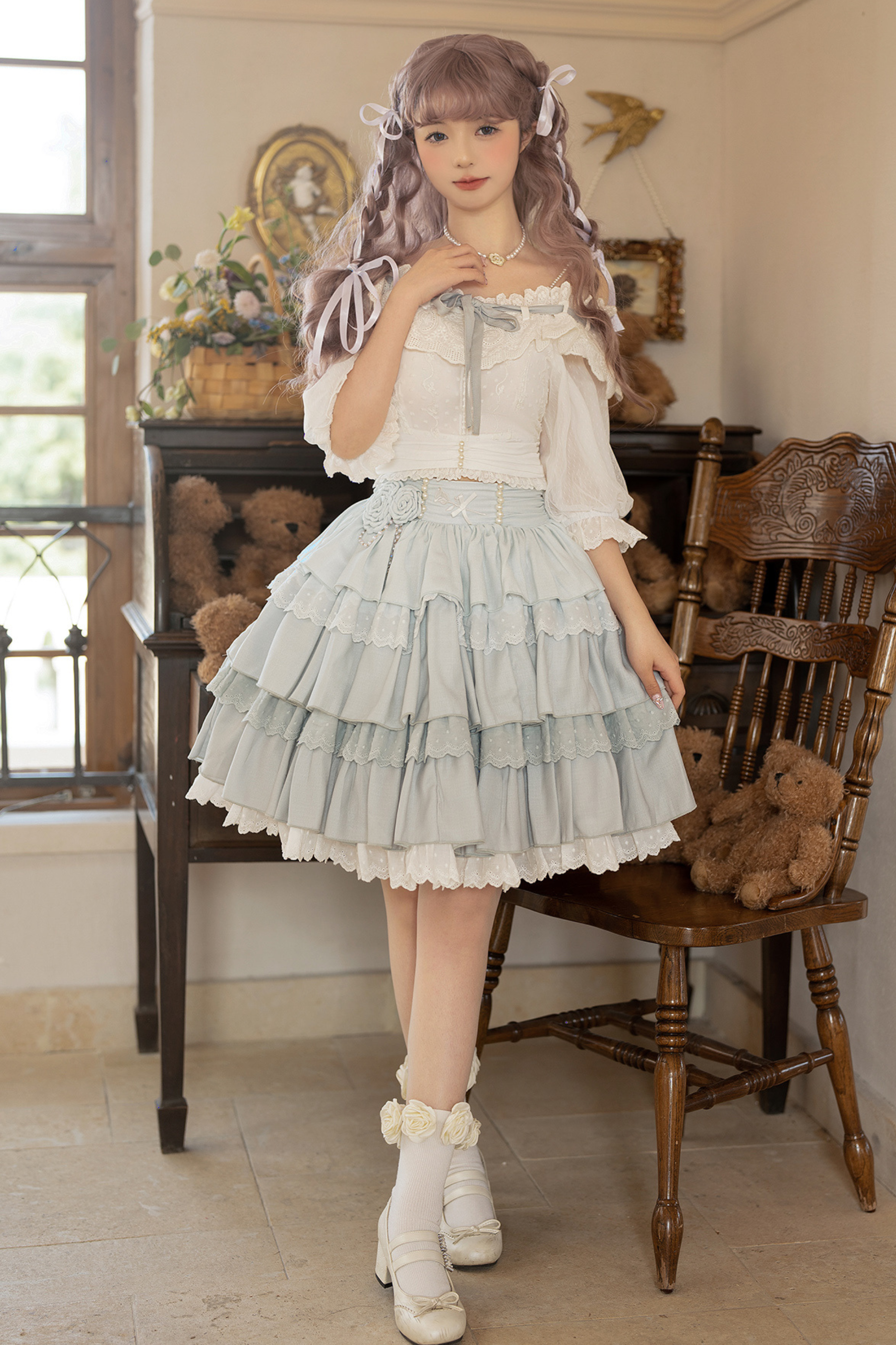青と白のオールドスクールロリータファッションドレス 蝶結びディテール JSK セット