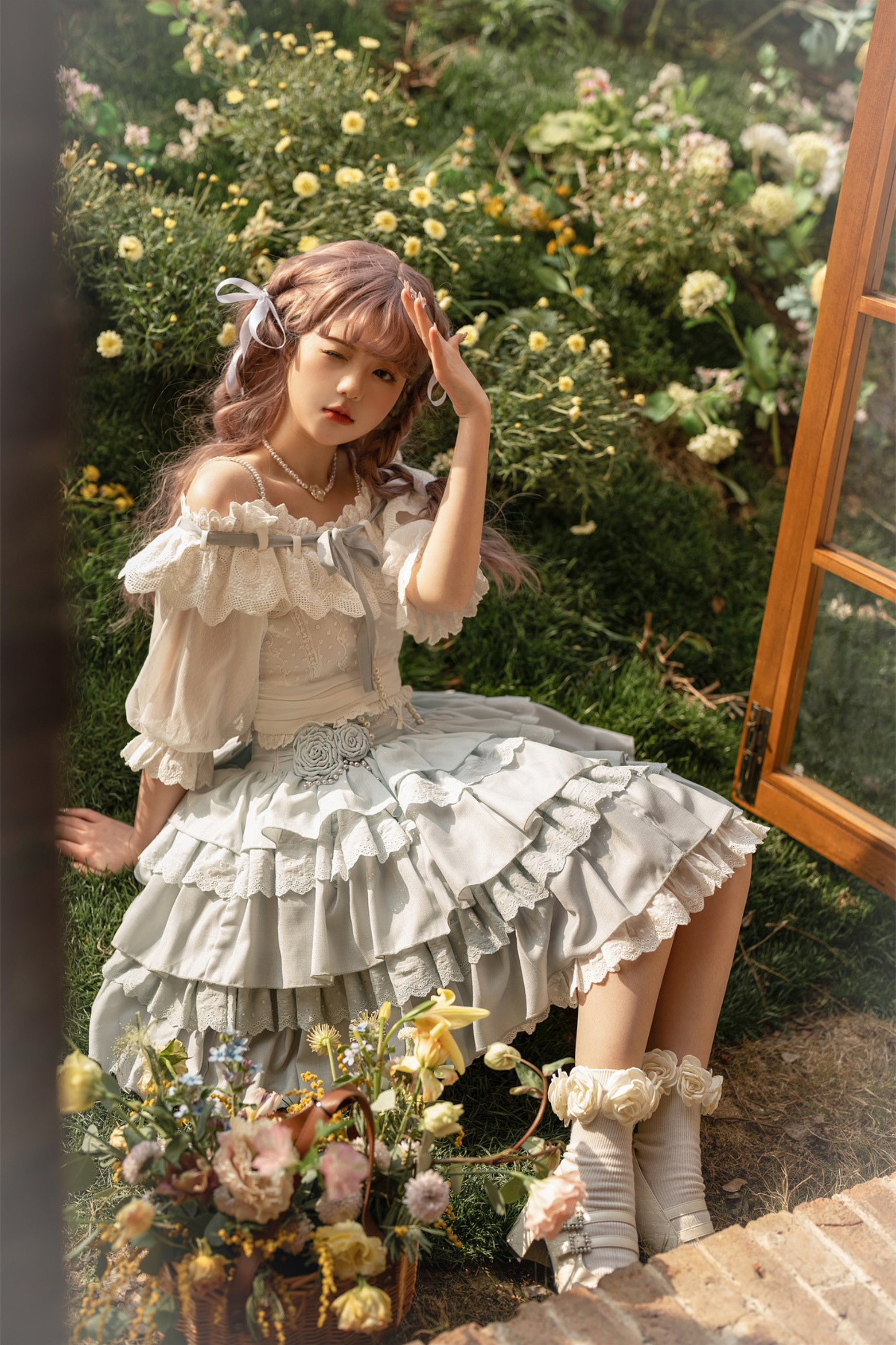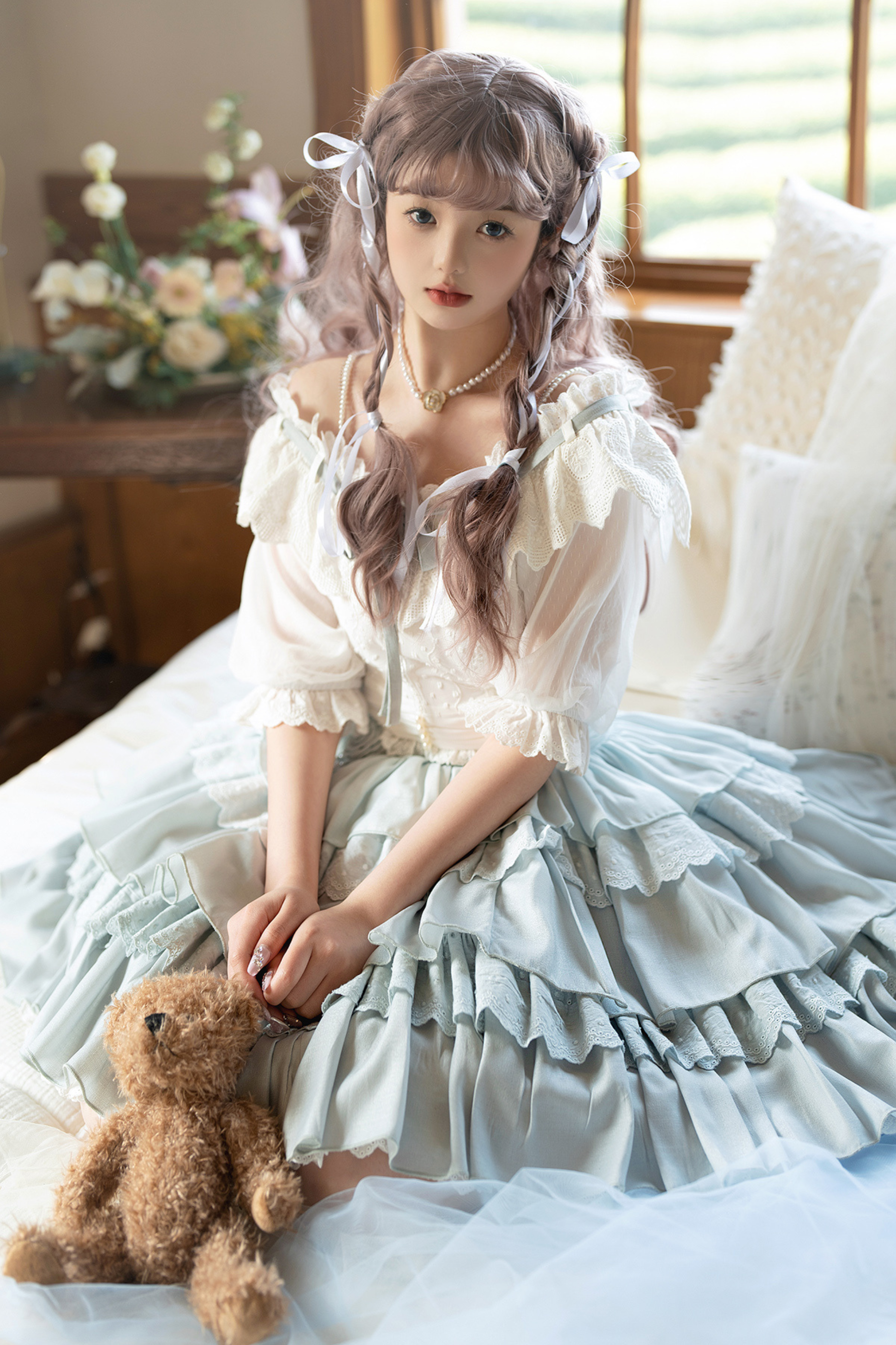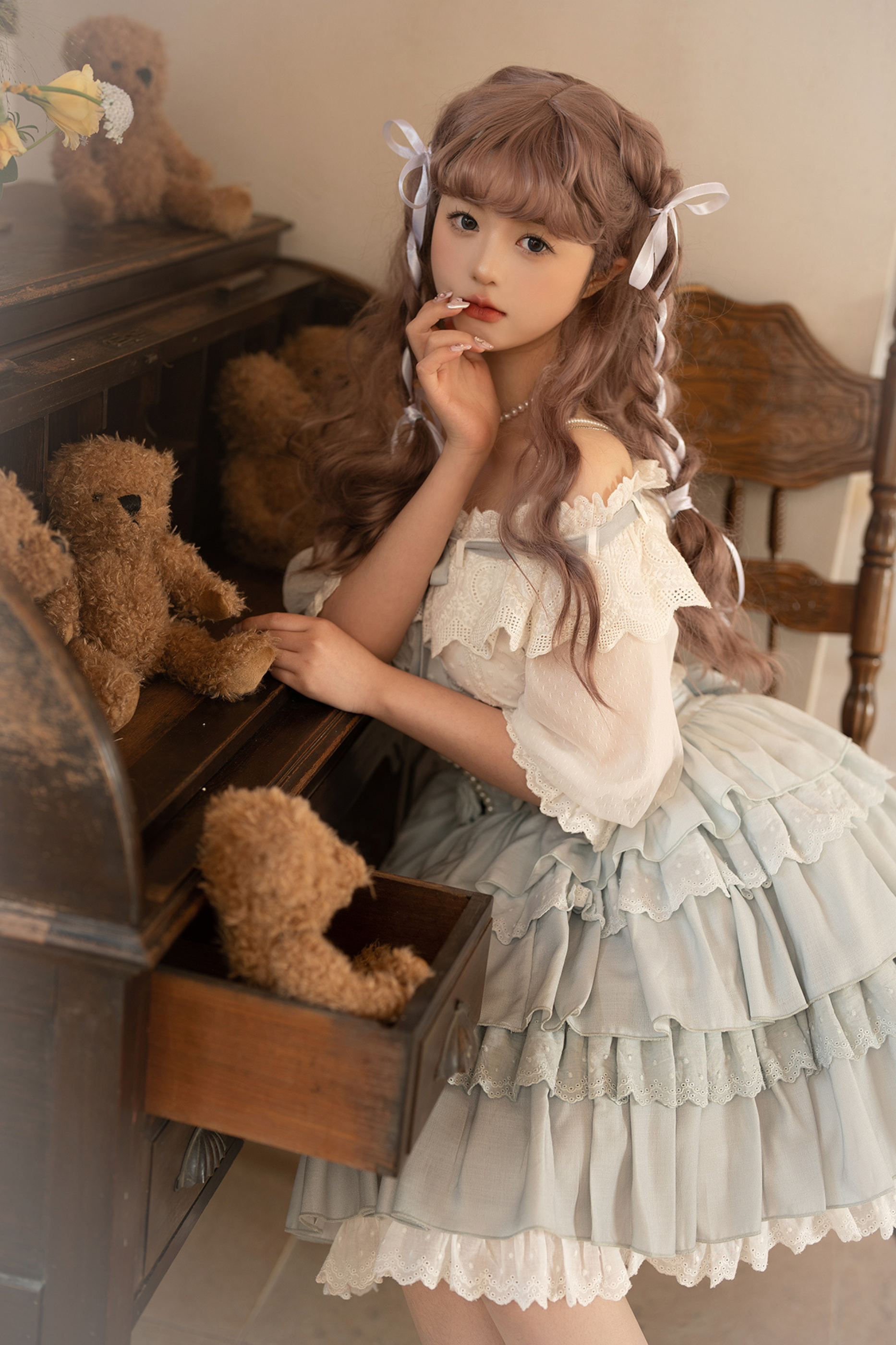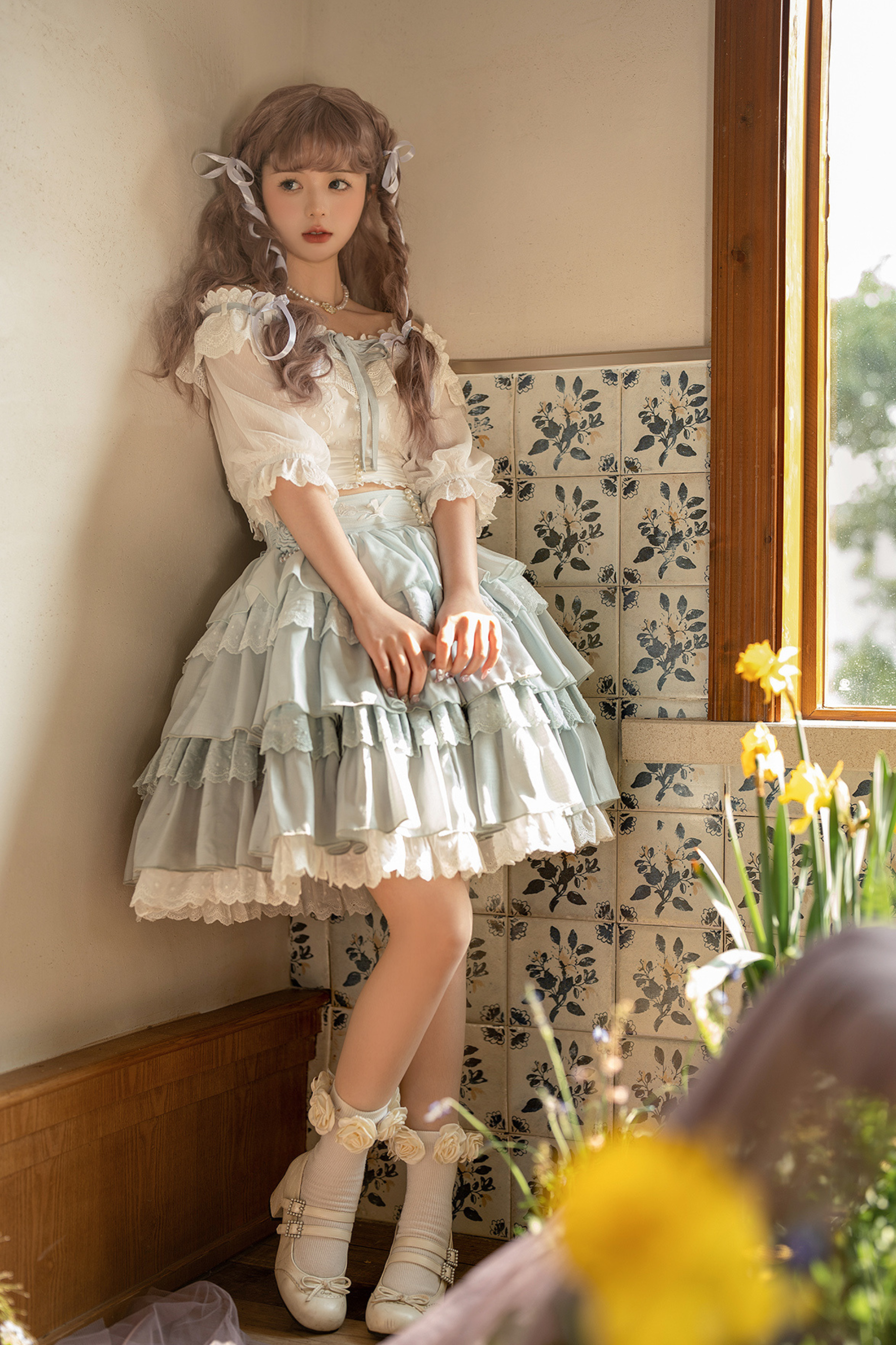 青と白のオールドスクールロリータファッションドレス 蝶結びディテール JSK セット