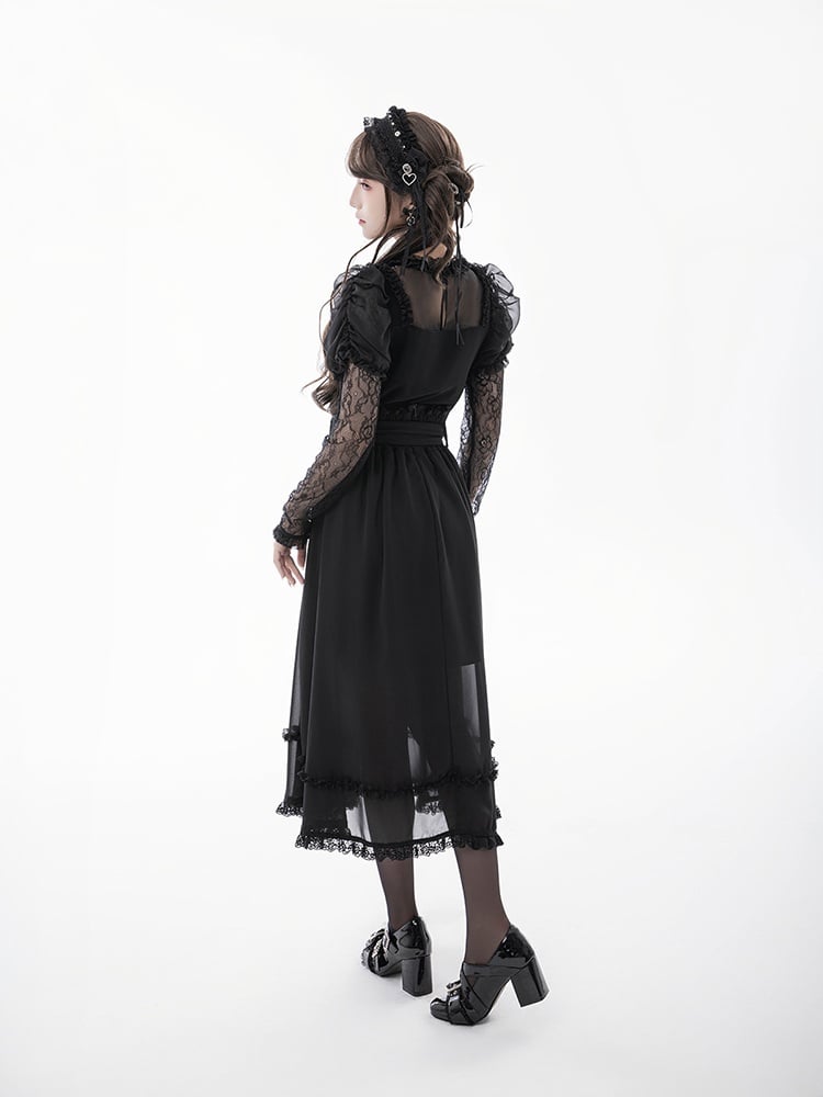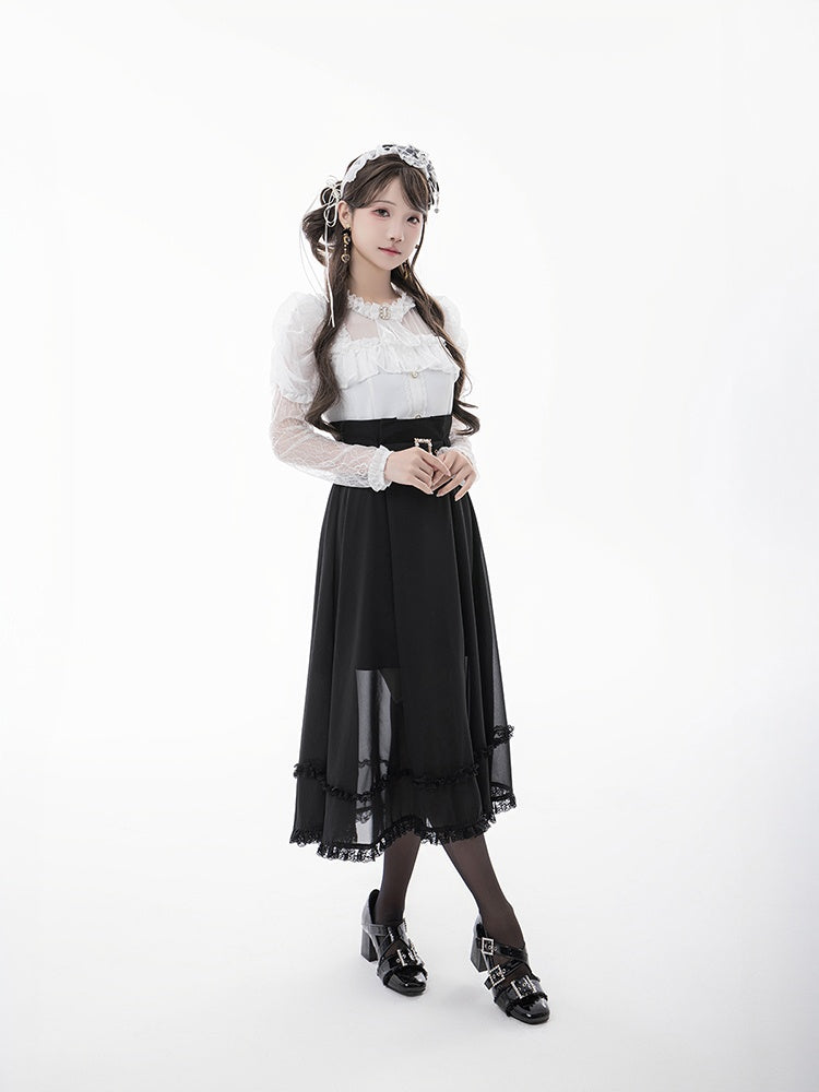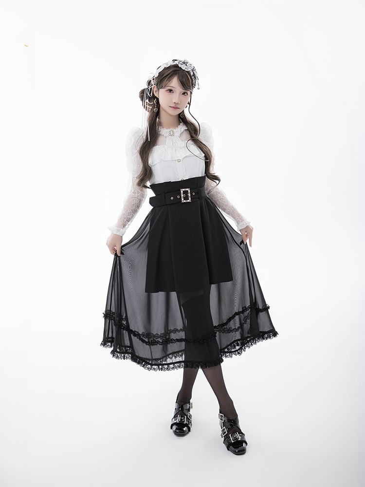 バックルベルト付きブラックハイウエストメッシュオーバーレイスカート