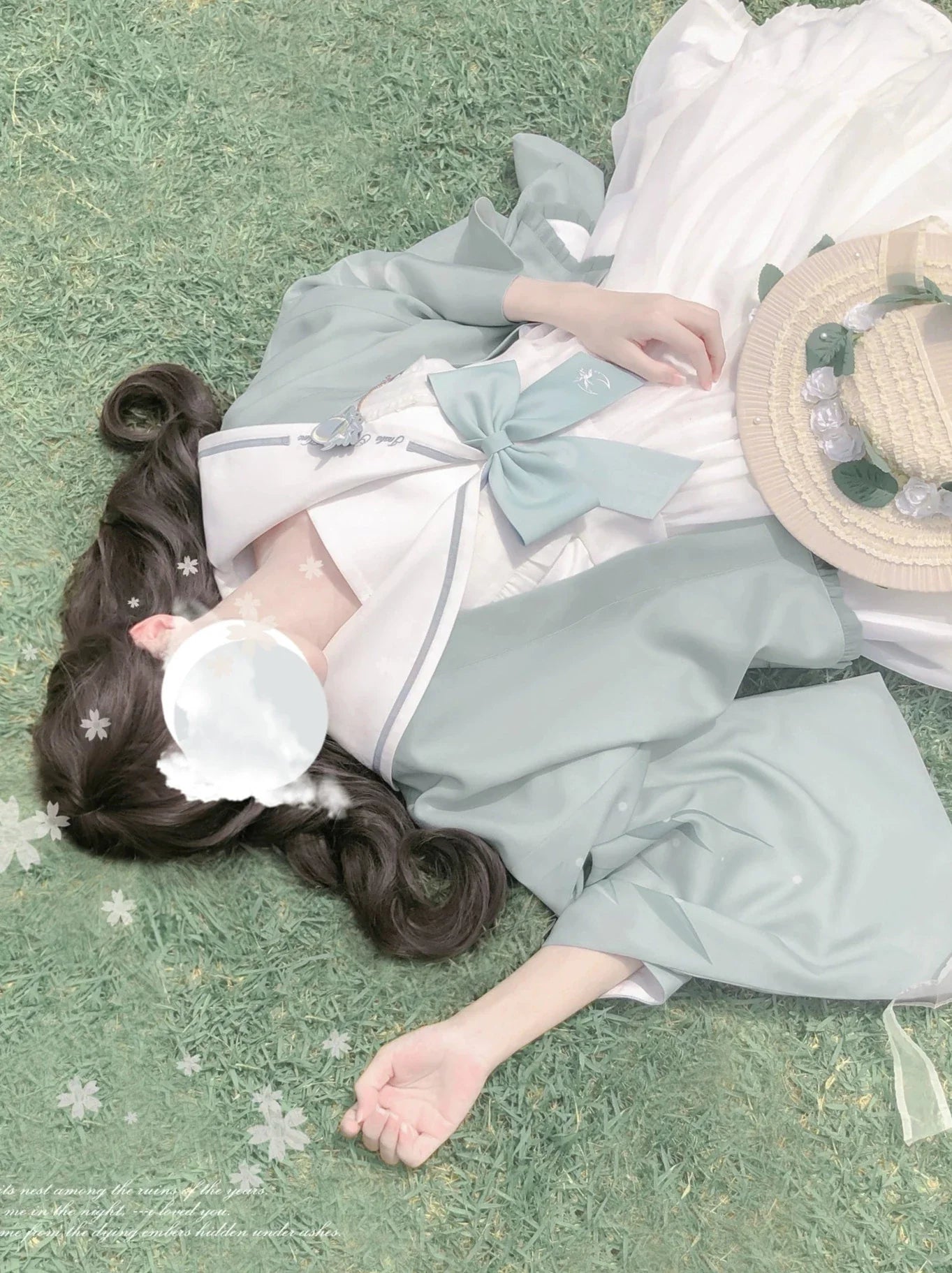 青と白のオールドスクールロリータファッションドレス 蝶結びディテール JSK セット