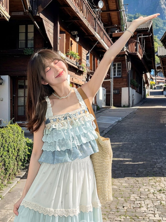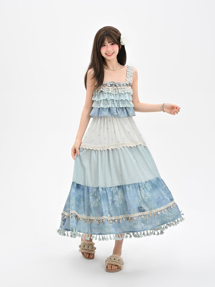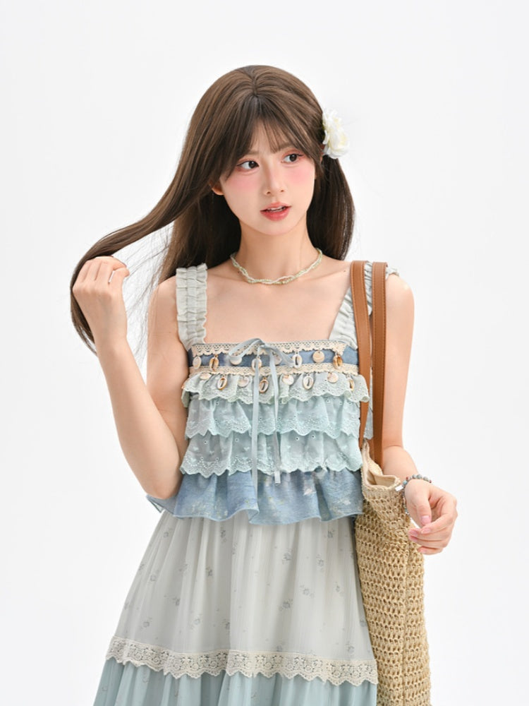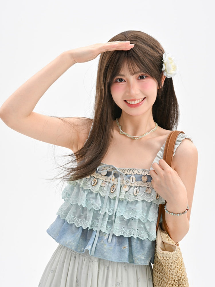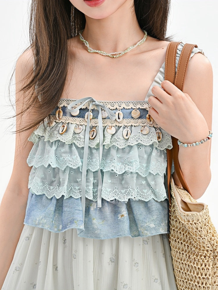 ノースリーブトップ シェルチャーム ティアードフリル ブルー