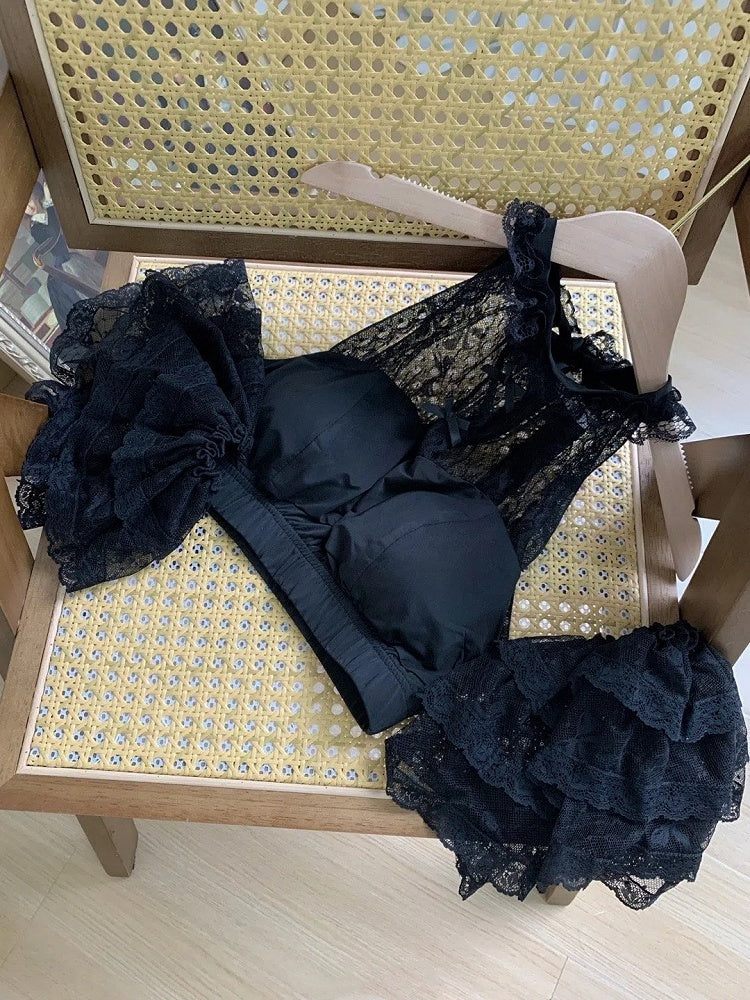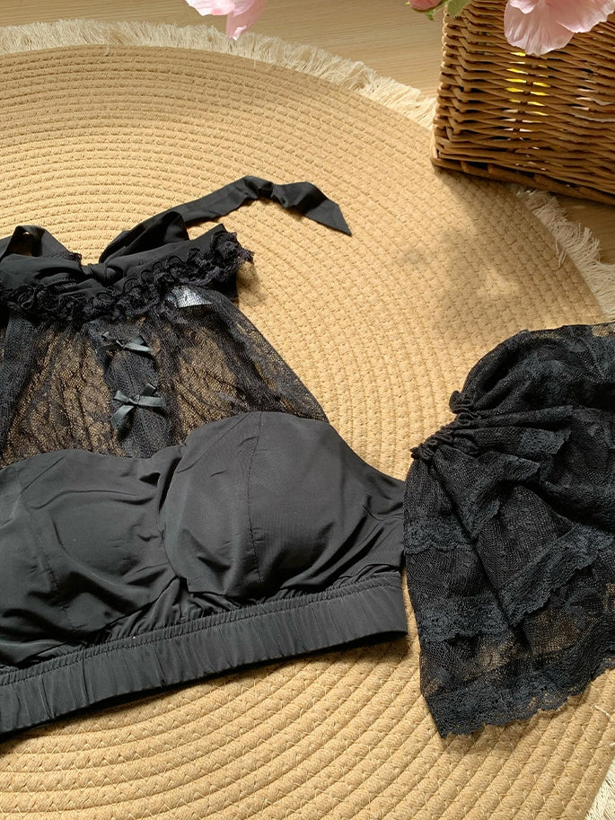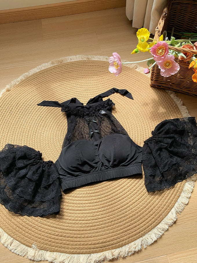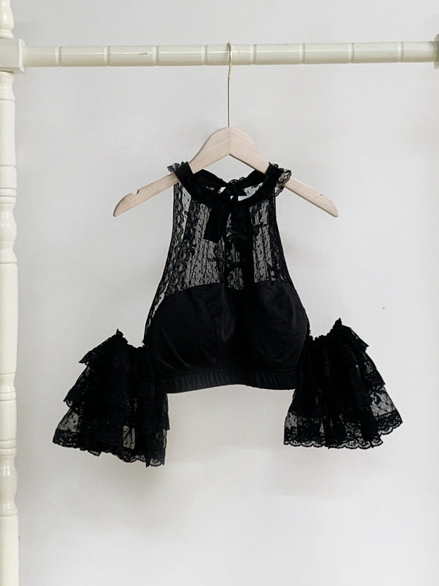 袖取り外し可能ホルターネックフリル付きレーストップス(ブラック)クロップド丈
