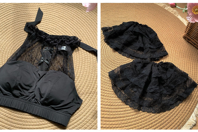 取り外し可能なレースのフラッタースリーブが付いたブラックのホルターネッククロップドトップス