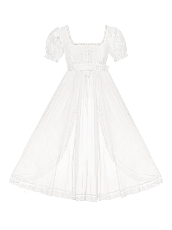 ホワイトのスクエアネックとパフスリーブのクロップドトップス + 取り外し可能なオーバーレイ