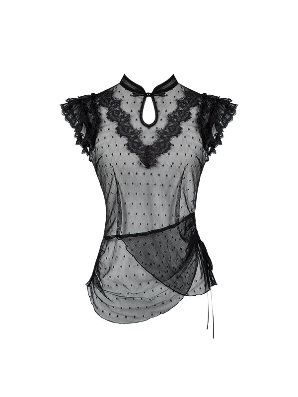 ブラックのチャイナカラーとフリル袖の透け感のあるドットチュールトップス