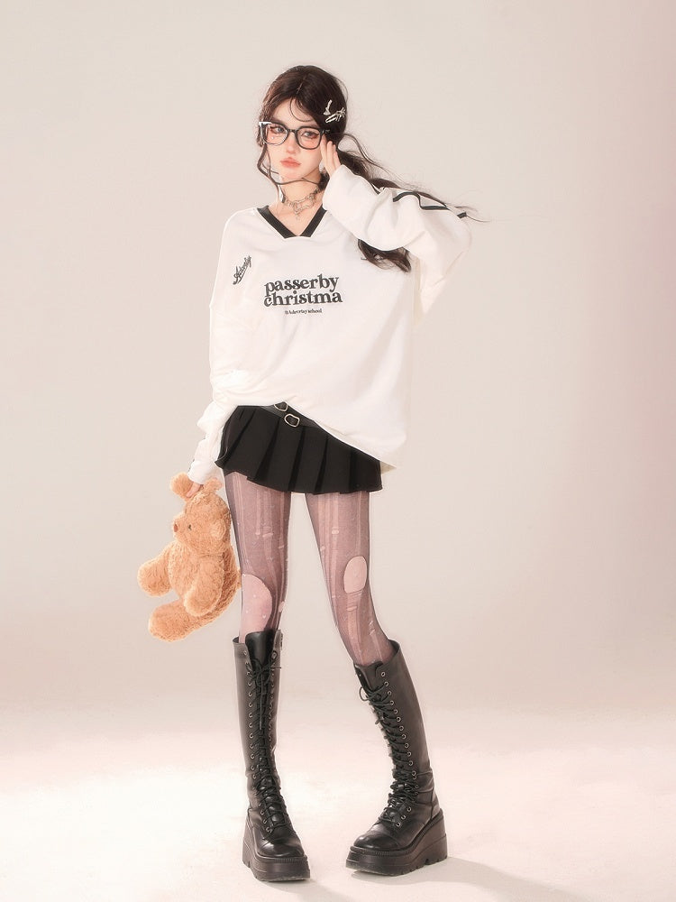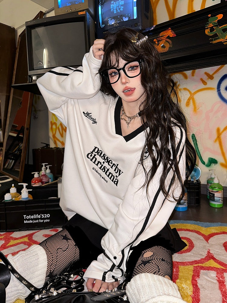 White V-Neck Long Sleeve Preppy Top with Lettering Print and Striped Sleeves