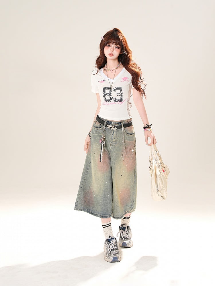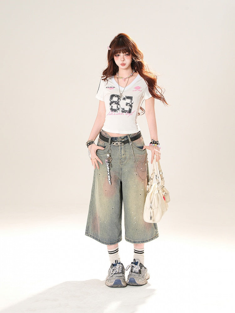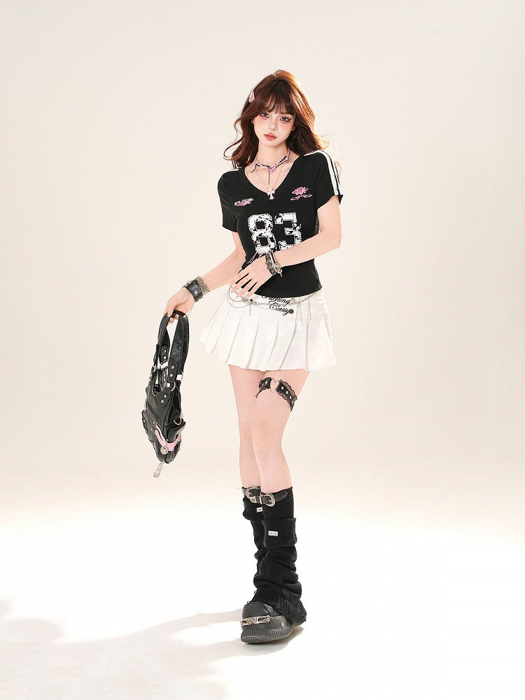 ホワイト/ブラック Vネック ナンバープリント ブロケットコア スリムフィット Tシャツ