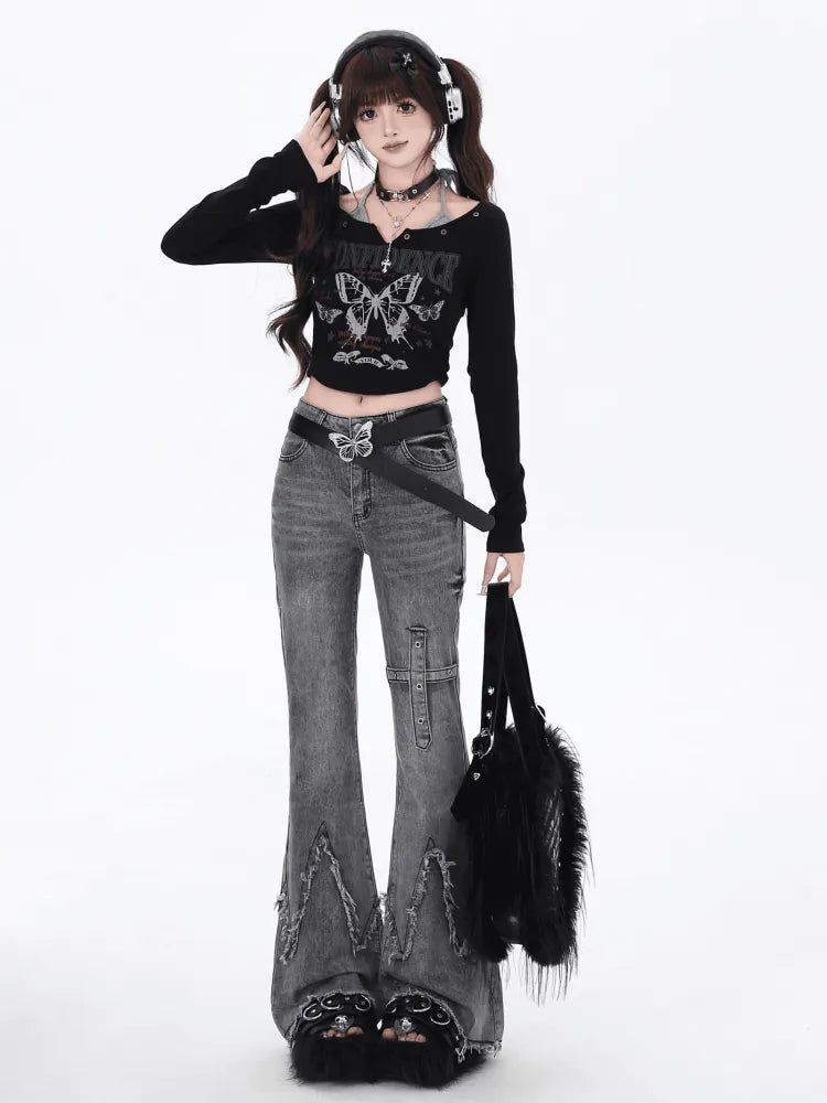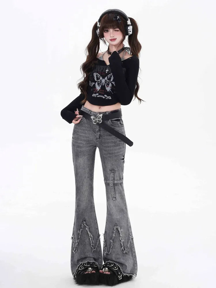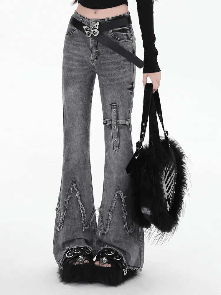 スリム ローフィット エッジ フレア グレー ジーンズ