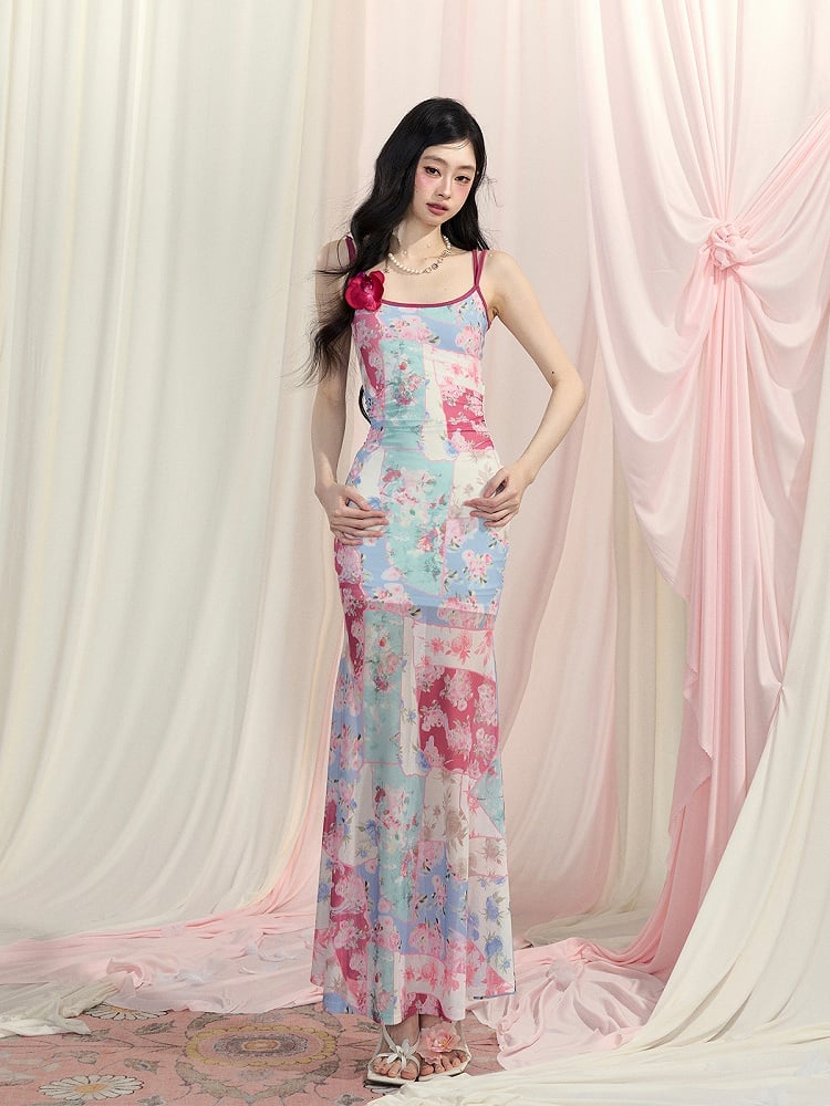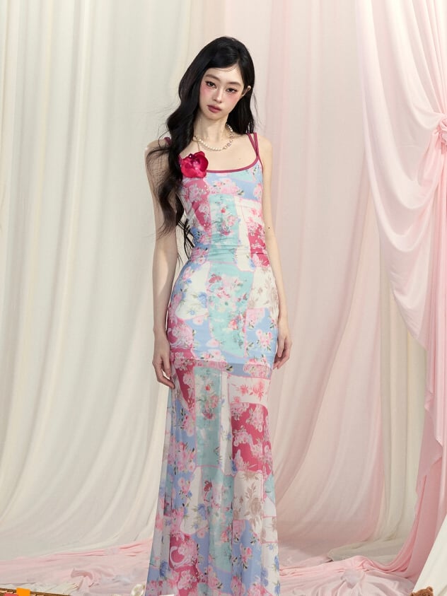 ブルーの油絵柄フローラルプリントバックレススリップドレスマーメイドスカート