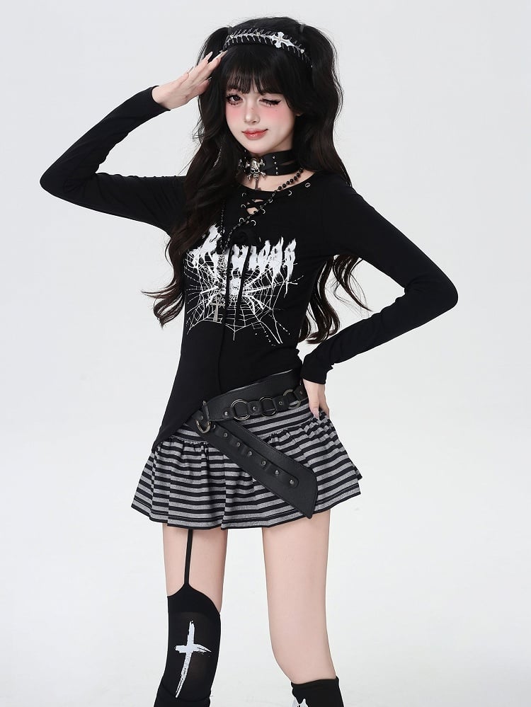 スパイダーウェブプリントのレースアップネックライン、アシンメトリーヘムのブラックトップス