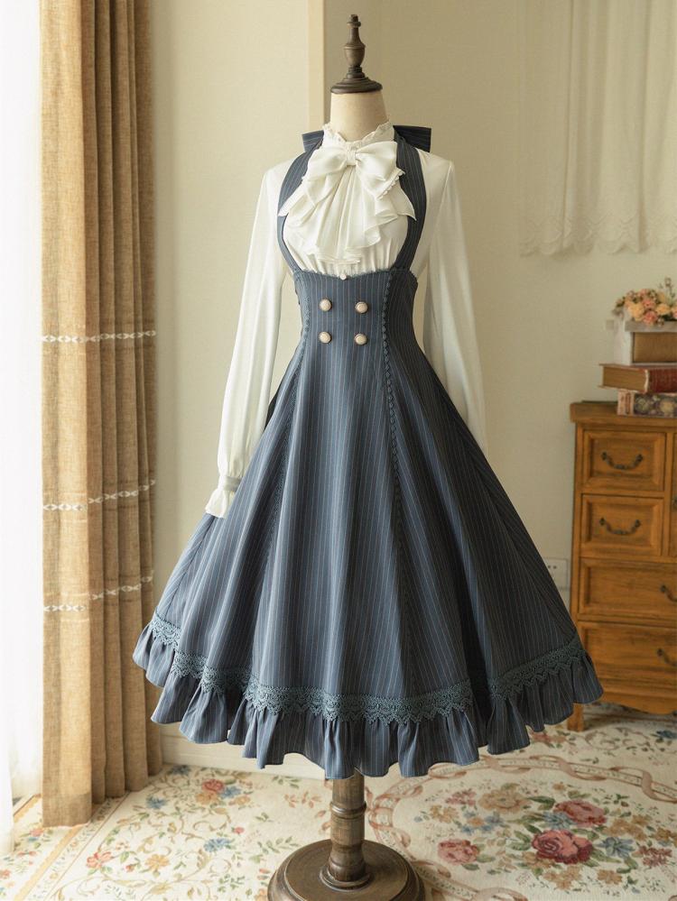 青と白のオールドスクールロリータファッションドレス 蝶結びディテール JSK セット