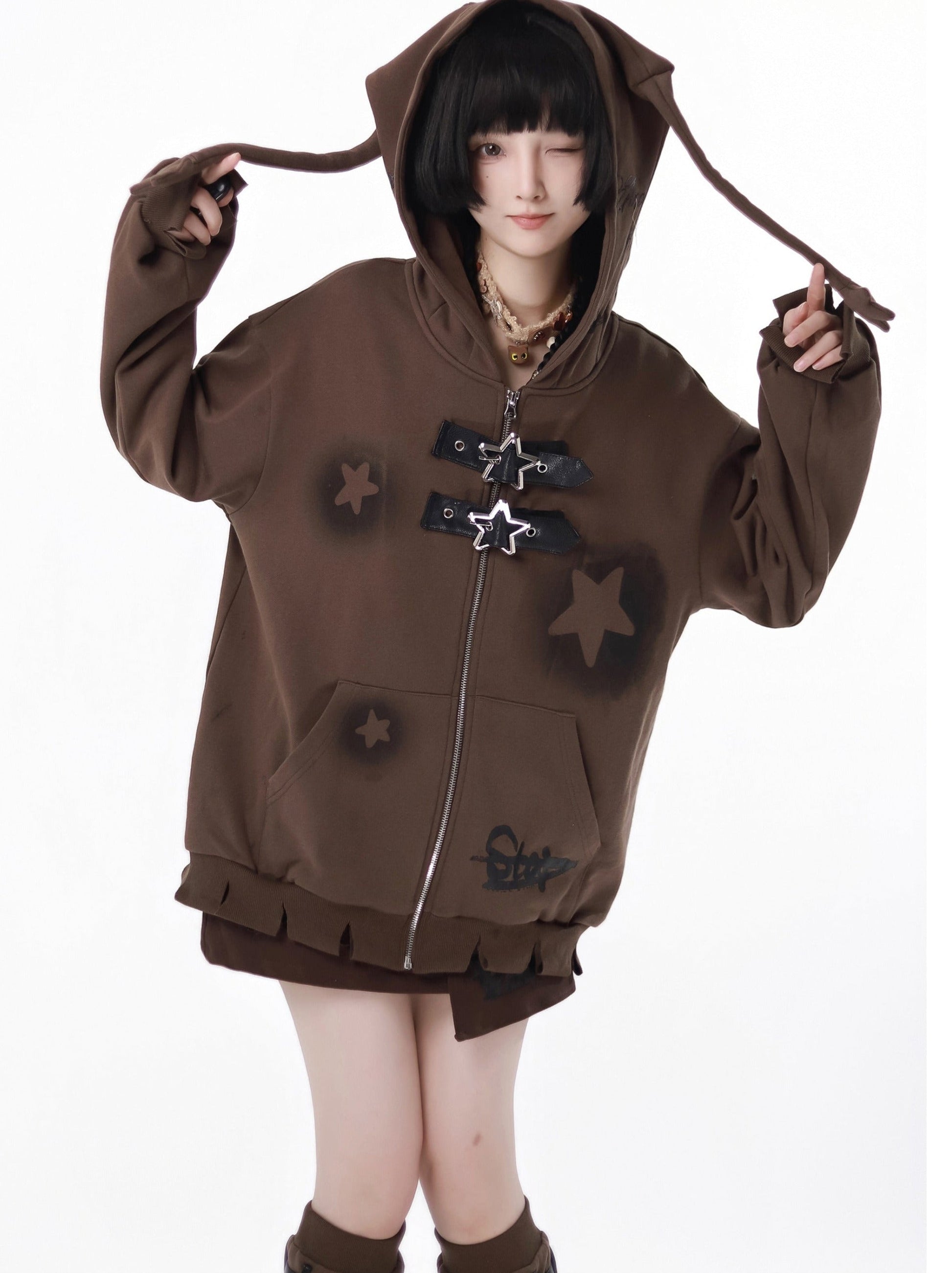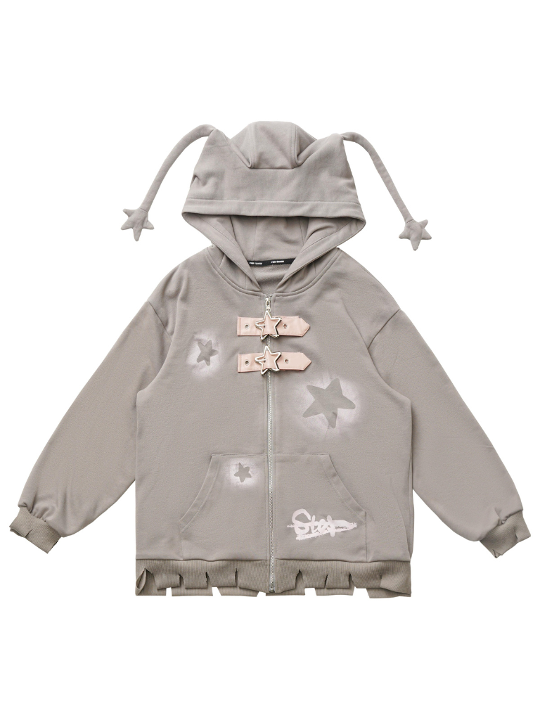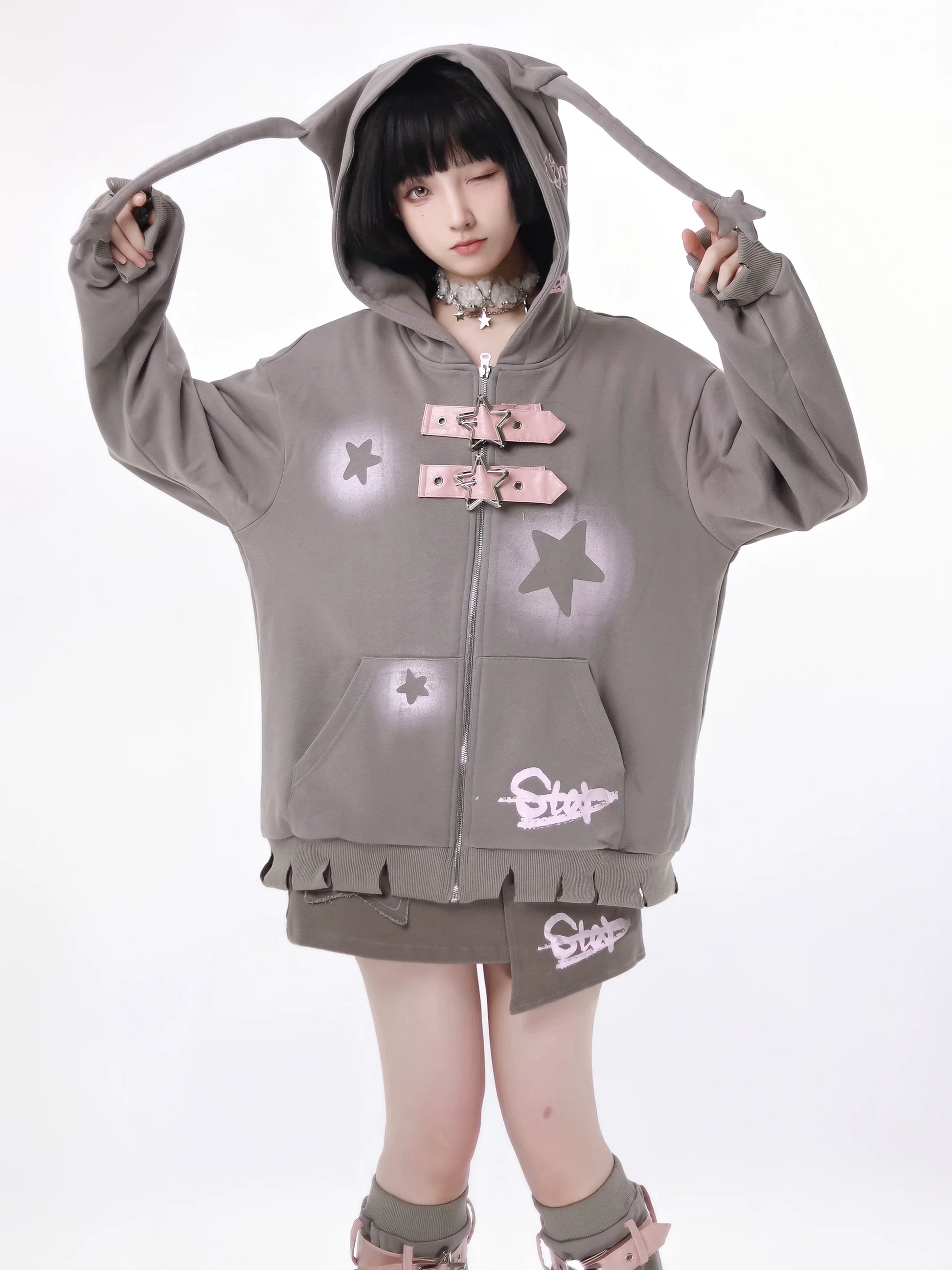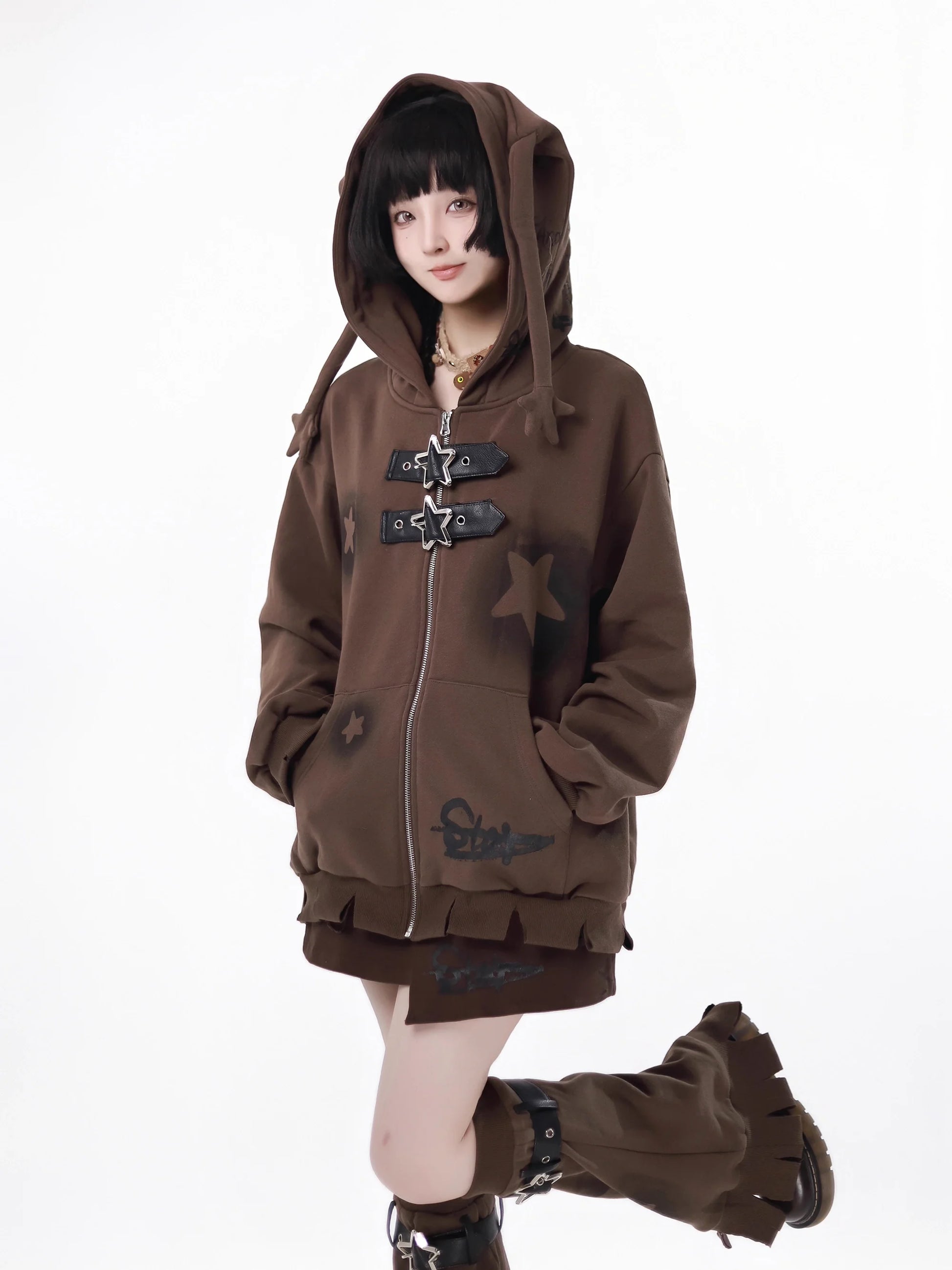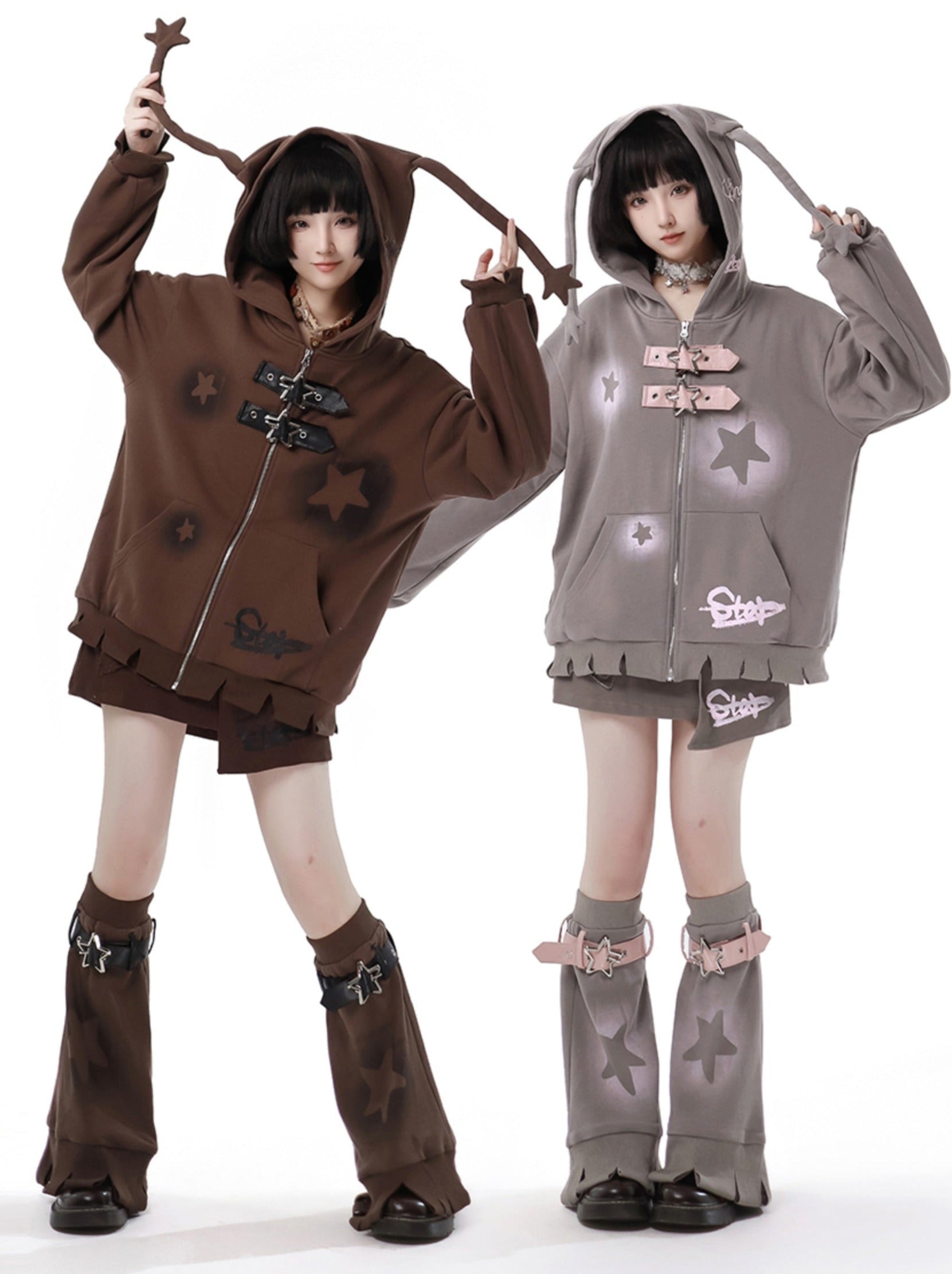 スターアメリカンプリントのルーズジップパーカーに、イレギュラースカートとレッグウォーマーを合わせれば、究極のキュートルックが完成!このキュートなコーディネートで、暖かくスタイリッシュに、そして人混みの中でも目立ちましょう。ゆったりとしたフィット感とジップアップデザインが、着心地と快適さをプラスします。