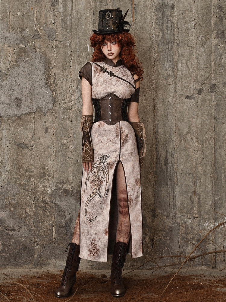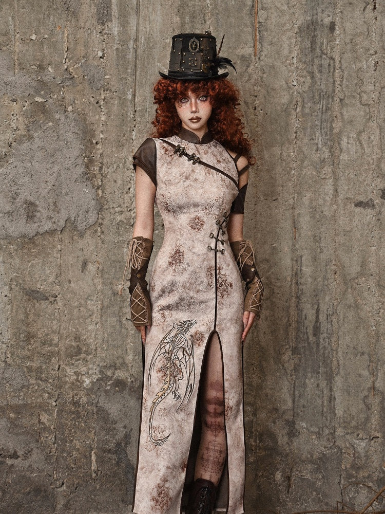 スチームパンクなアシンメトリースリーブのドラゴン刺繍ドレス