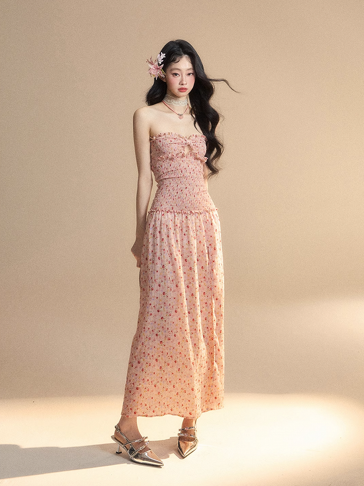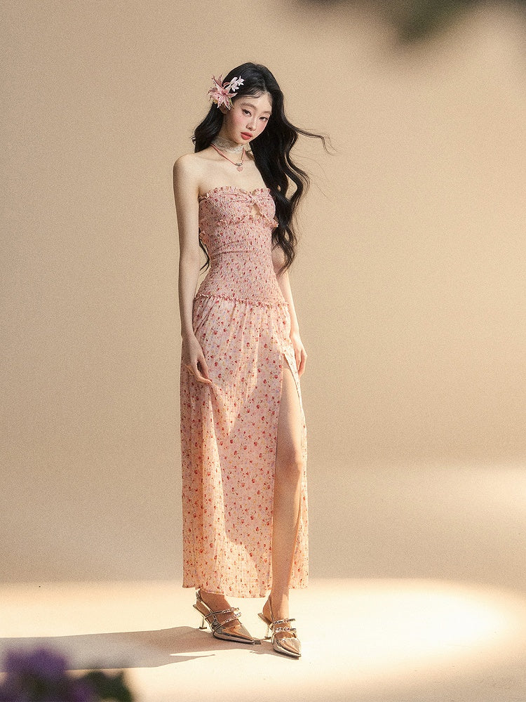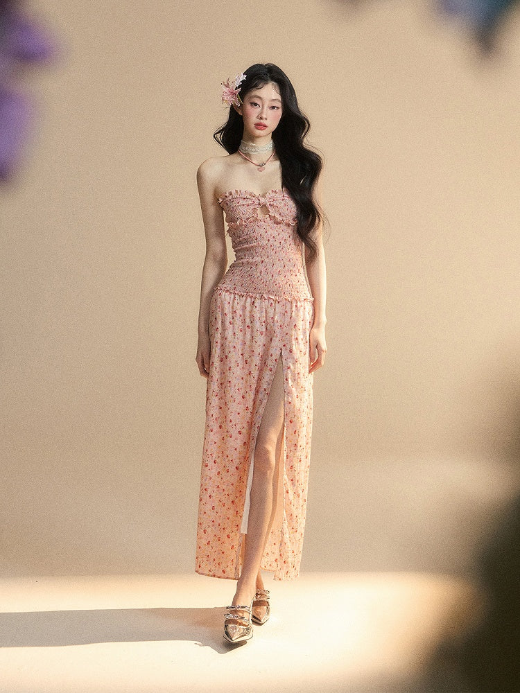 ストラップレスドレス、伸縮性のある太もも丈スリット、花柄ウエスト、ピンクのスウィートハートネックライン、スモック
