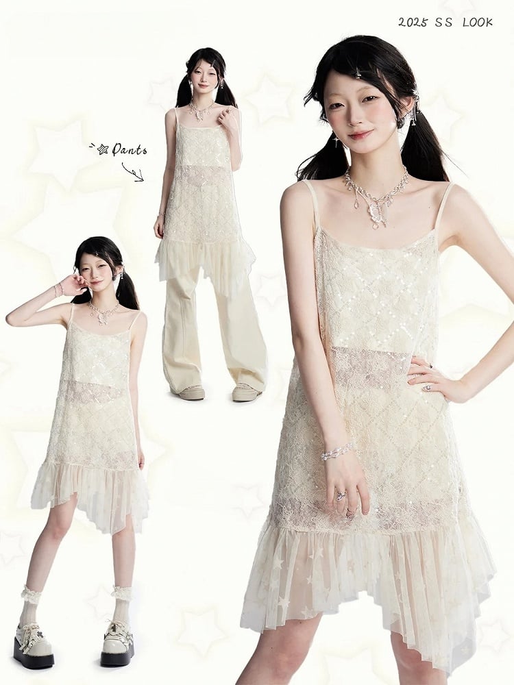 アプリコット セミシアー スター柄 アシンメトリーヘム スパンコール メッシュ スリップドレス/アプリコット クロップド ストラップレス トップ