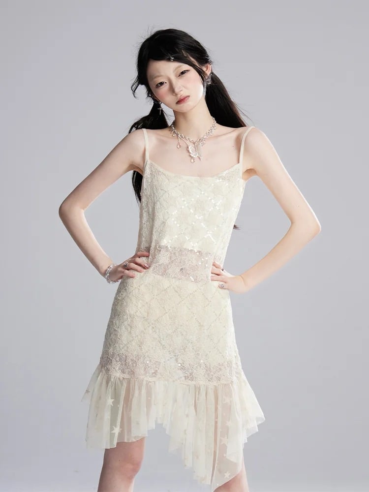 ストラップレスヘムクロップド丈スパンコールメッシュスリップドレス/アプリコットアプリコットセミシースルートップスター柄アシンメトリー