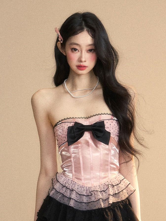 水玉模様の大きなリボンとレイヤードのフリルレーストリムのピンクメッシュストラップレストップス