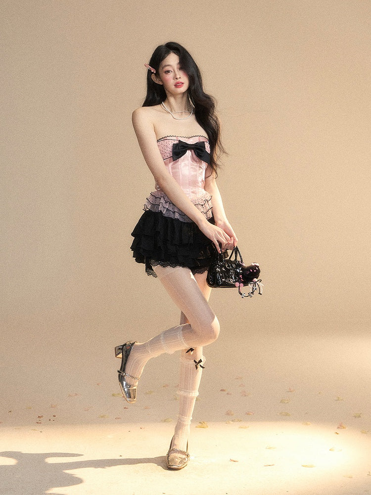 ストラップレストップパターン ピンク レイヤード レース メッシュ ビッグリボン フリル 水玉模様